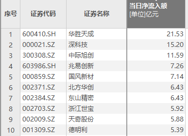 上证报中国证券网讯(记者费天元)Choice数据显示,2月13日,资金净流入额排名前十的个股依次是华胜天成、深科技、中际旭创、兆易创新、国风新材、北方华创、东山精密、浙江世宝、天奇股份、德明利。其中,华胜天成获净流入21.53亿元。
