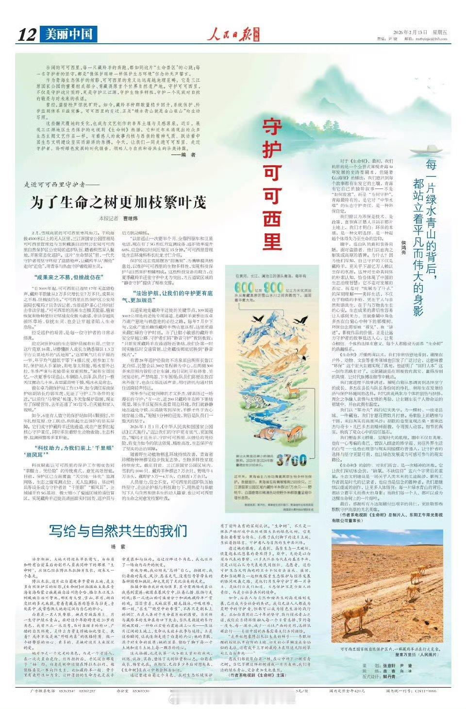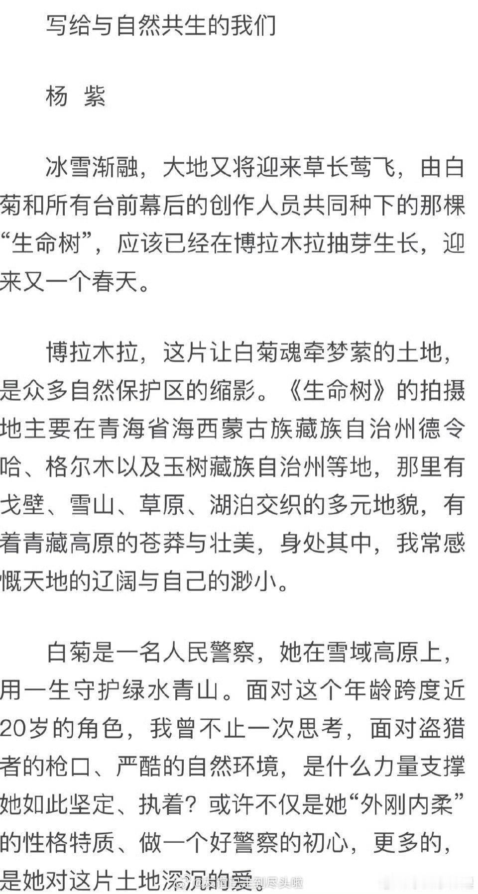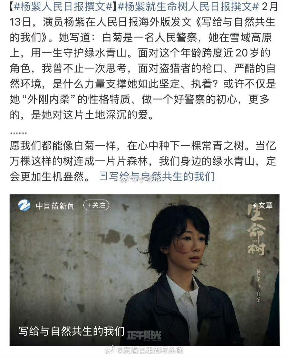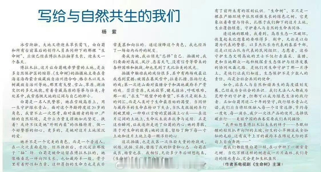 杨紫人民日报撰文杨紫在《人民日报海外版》撰文《写给与自然共生的我们》,有思想有深