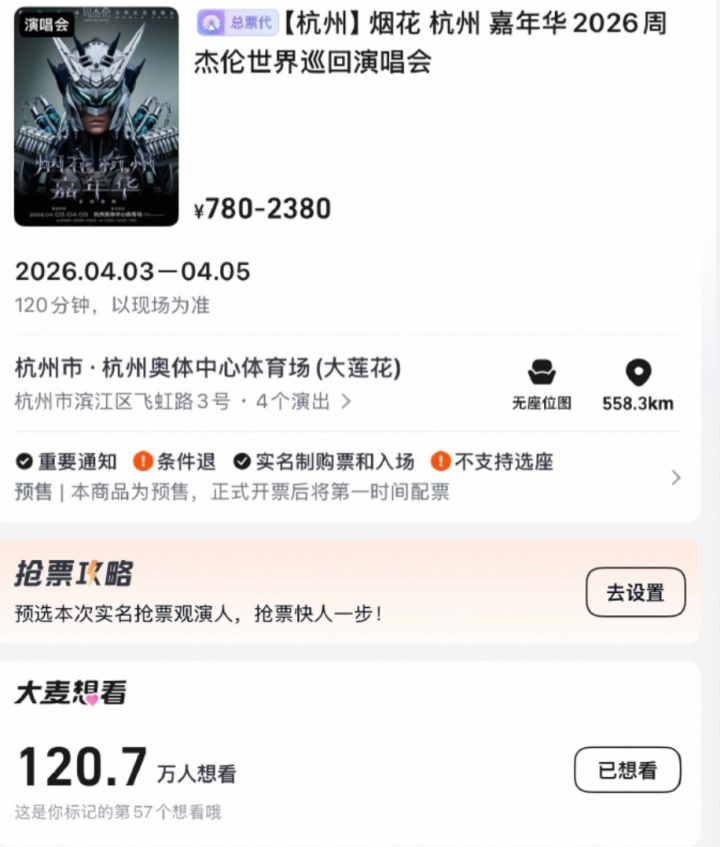 将于4月3、4、5日在“大莲花”举行的周杰伦「烟花杭州·嘉年华Ⅱ」2026世界巡演杭州站,刚刚,售票信息正式上架。