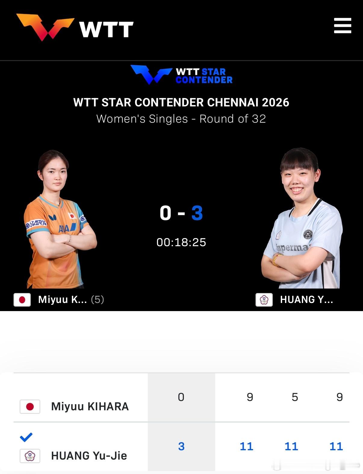 WTT球星挑战赛金奈站2026 女单1/16决赛:(中国台北)黄愉倢3比0木原美