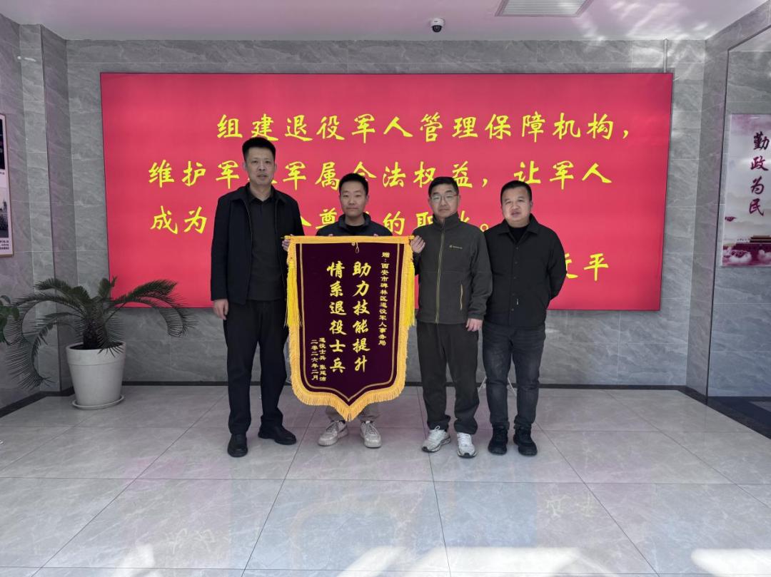 2月9日,自主就业退役士兵张延沛与就职单位西安爱克斯未来职业技能培训学校负责人一同,将一面印有“助力技能提升情系退役士兵”字样的锦旗,郑重送到碑林区退役军人事务局。这面锦旗,不仅承载着退役士兵的诚挚谢意,更标志着碑林区退役军人事务局在探索“订单式”组织、“菜单式”教学、“工单式”就业的“三单式”培训模式上,结出的又一硕果。