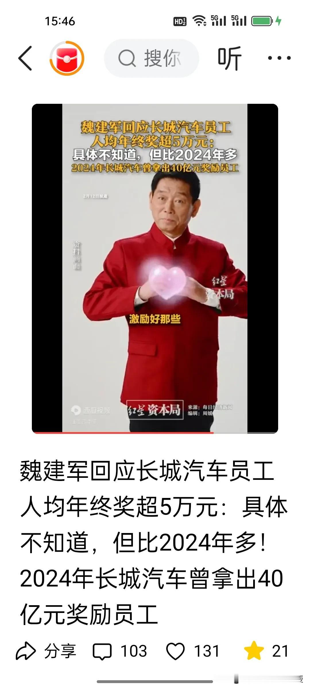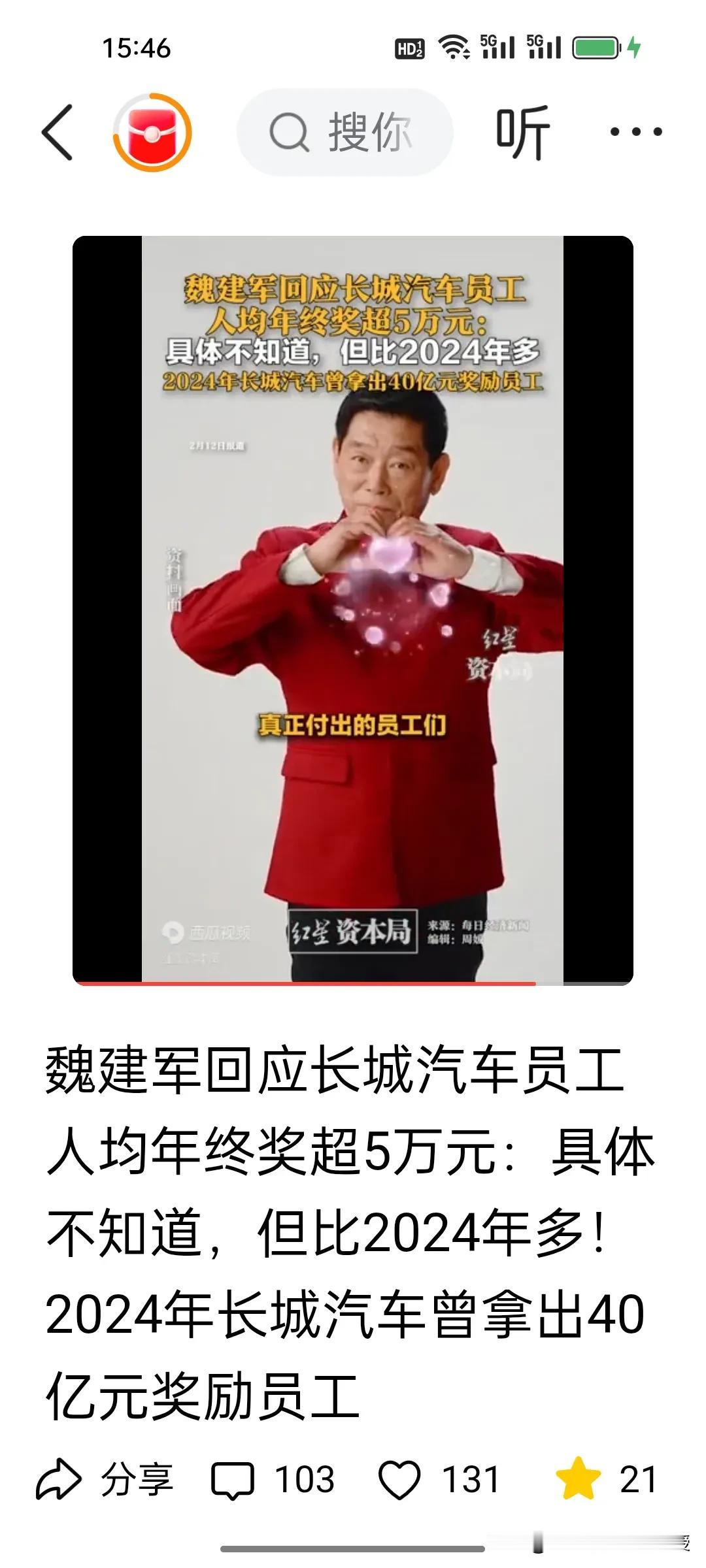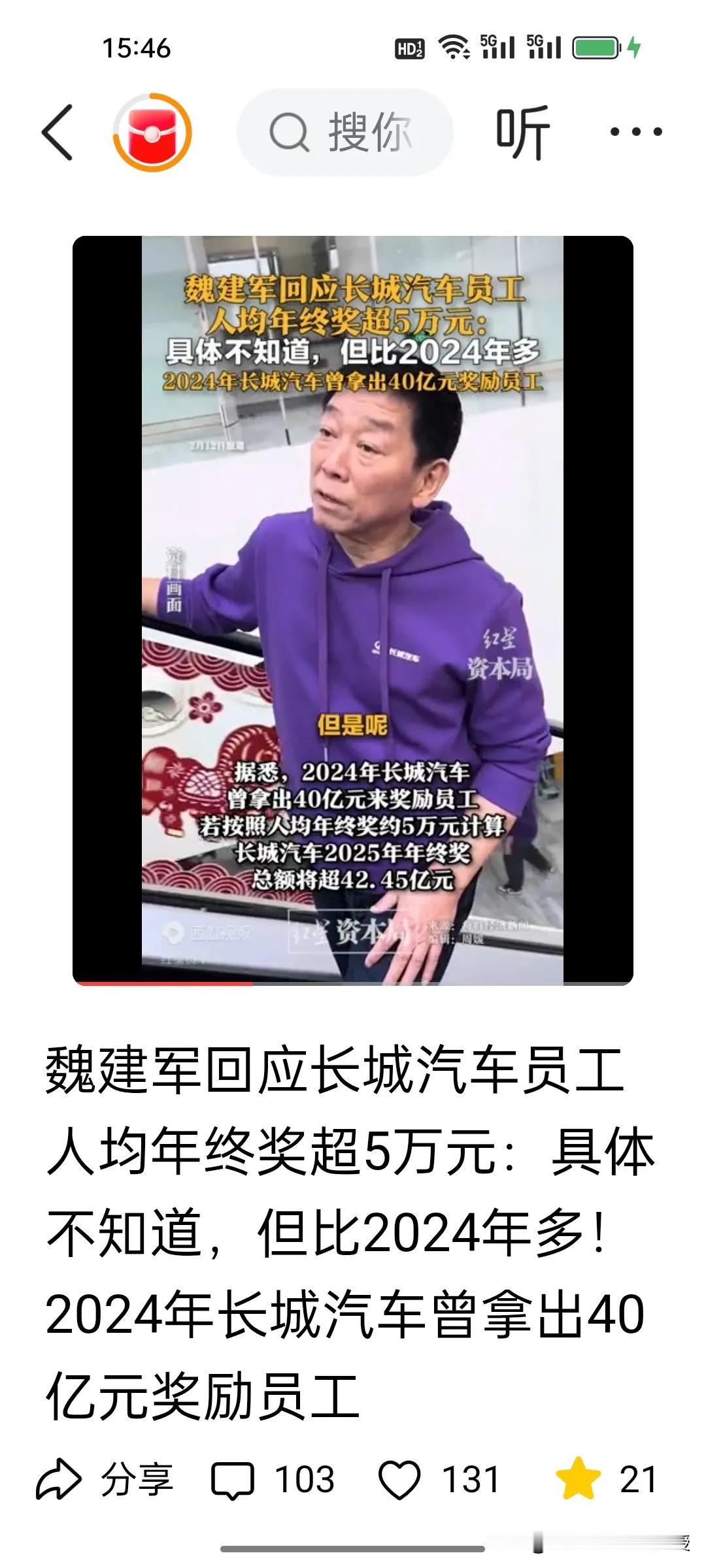 长城汽车人均年终奖超5万,魏建军:要奖励真正付出的人! 长城汽车2025年年终奖人均超5万,比2024年的40亿总奖励还多,总额预计超42.45亿。魏建军明确表态:要奖励那些真正付出的员工,激励好奋斗者。 对比其他车企:比亚迪人均约3-4万,吉利约2-3万,长城的年终奖手笔明显更豪横。在车市内卷的当下,长城愿意把真金白银砸向一线员工,而不是高管,格局一下就打开了。 这种“不玩虚的,只奖实干”的思路,才是车企能跑赢市场的底气。