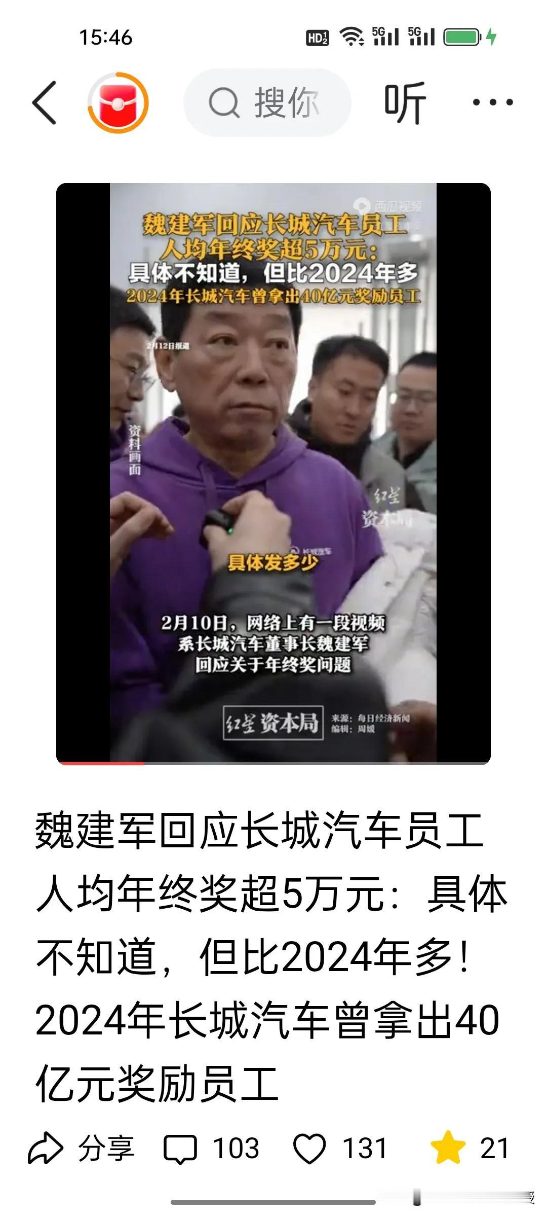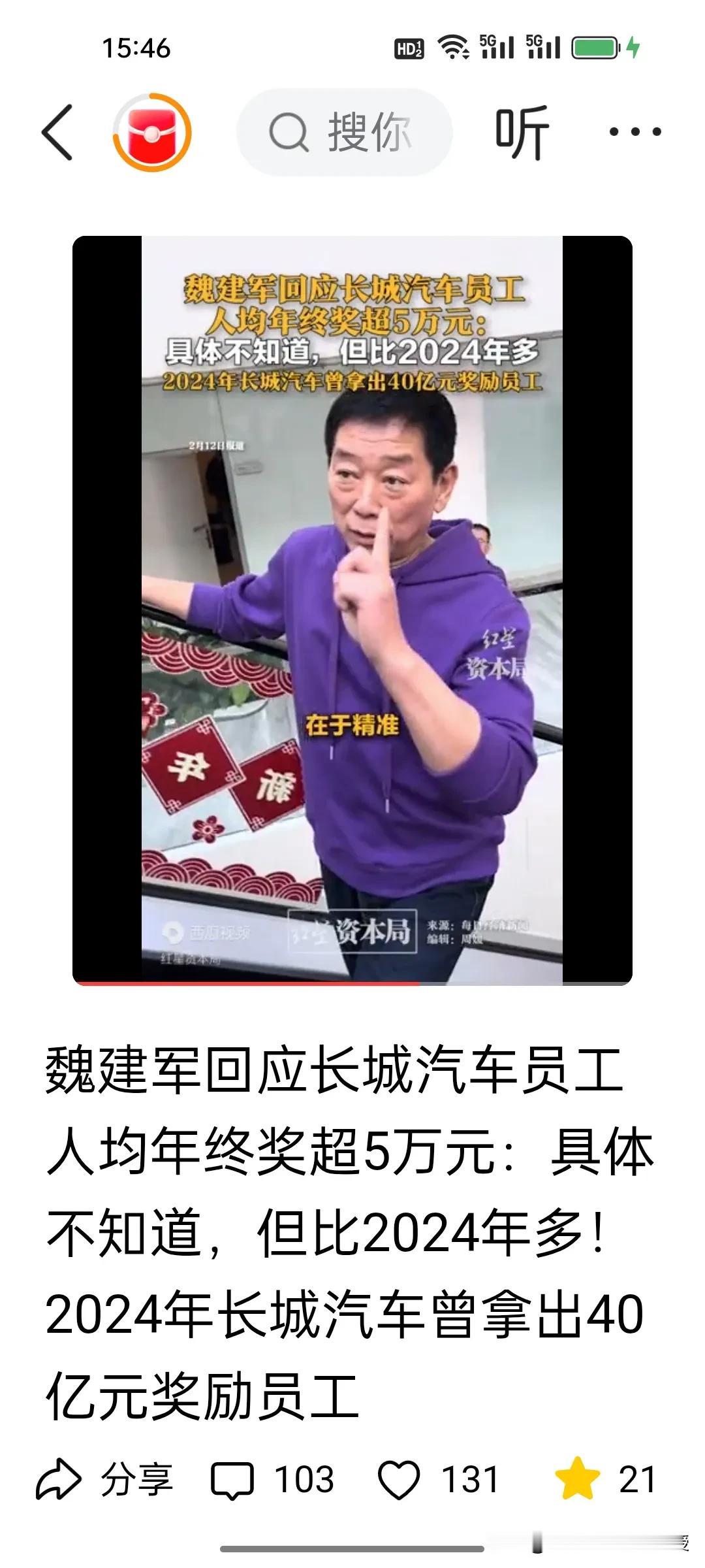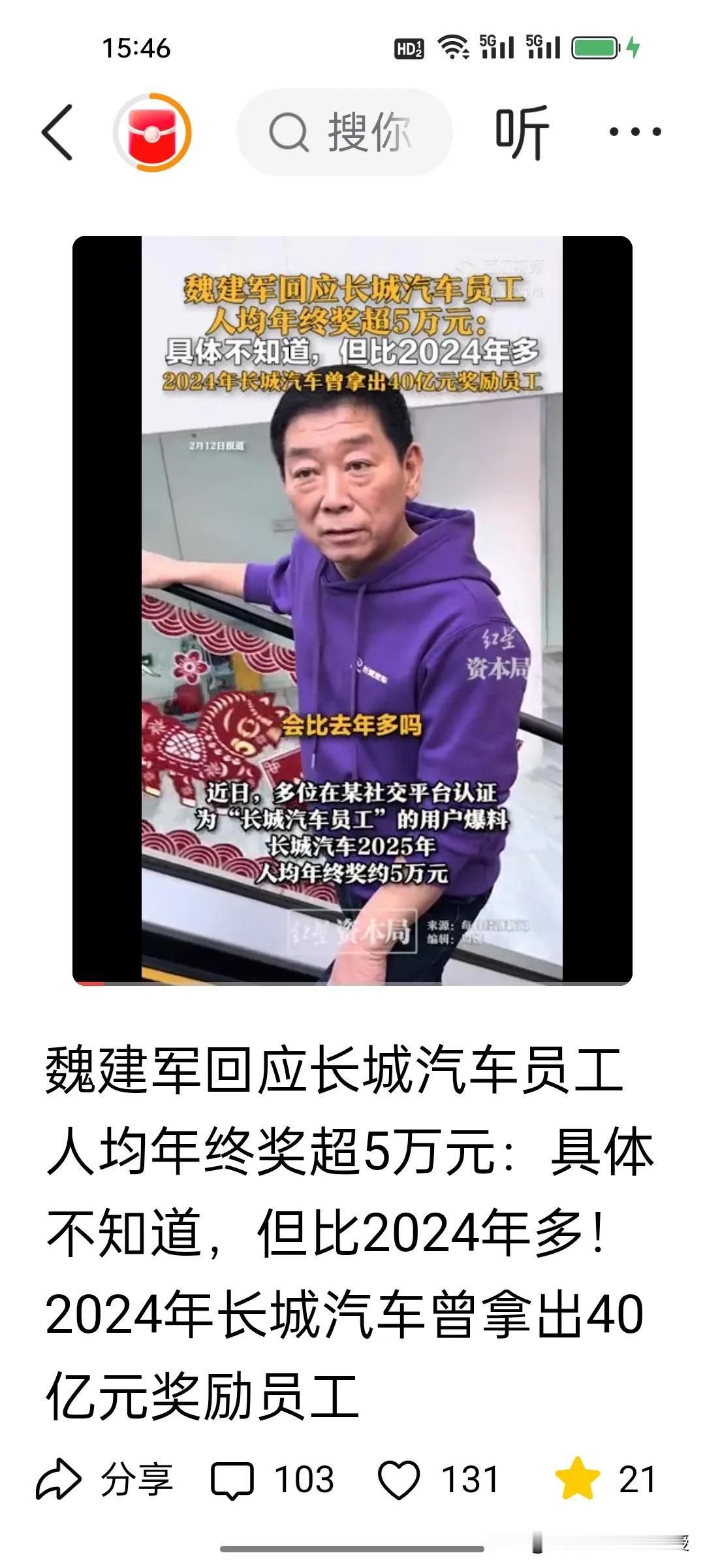 长城汽车人均年终奖超5万,魏建军:要奖励真正付出的人! 长城汽车2025年年终奖人均超5万,比2024年的40亿总奖励还多,总额预计超42.45亿。魏建军明确表态:要奖励那些真正付出的员工,激励好奋斗者。 对比其他车企:比亚迪人均约3-4万,吉利约2-3万,长城的年终奖手笔明显更豪横。在车市内卷的当下,长城愿意把真金白银砸向一线员工,而不是高管,格局一下就打开了。 这种“不玩虚的,只奖实干”的思路,才是车企能跑赢市场的底气。
