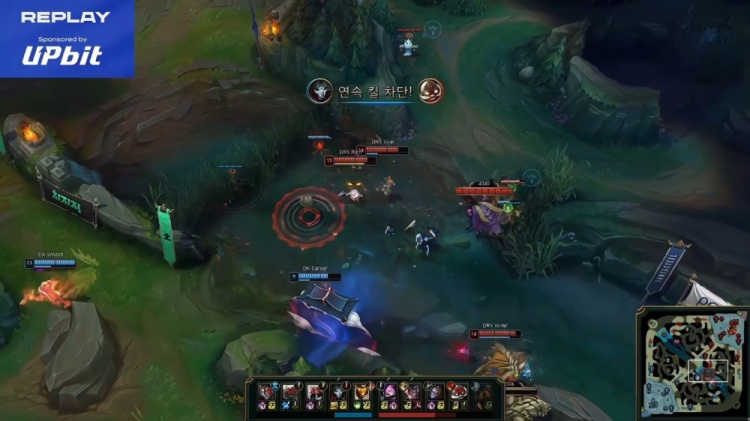 [23:58]上河道4v4,Andil泰坦钩人开团,DK中野二人瞬间被杀,Rich凯南下路再次打残Siwoo杰斯,后者被小兵单杀,正面DRX轻松拿到大龙,经济领先4.5k。