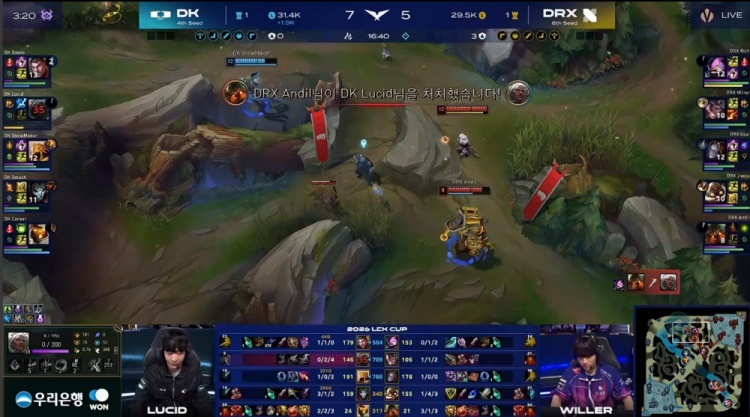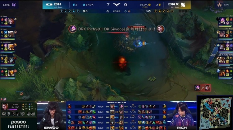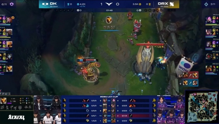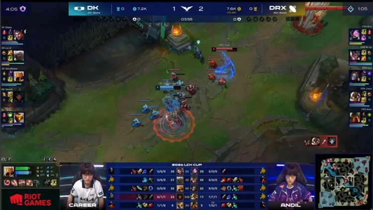 [18:35]河道团战,Lucid安蓓萨独自进场先被融化,Siwoo杰斯中路被钩再送人头,许哥沙皇不在正面DK就被开团,DRX打出0换2推掉DK中路一塔,经济领先1k。