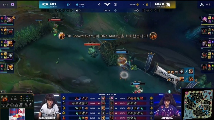 [6:07]下河蟹团4v4,Lucid安蓓萨闪现拉开,许哥沙皇一推二,DK瞬间打出1换3,但Career巴德拿到两个人头,双方经济差距在1k之内。
