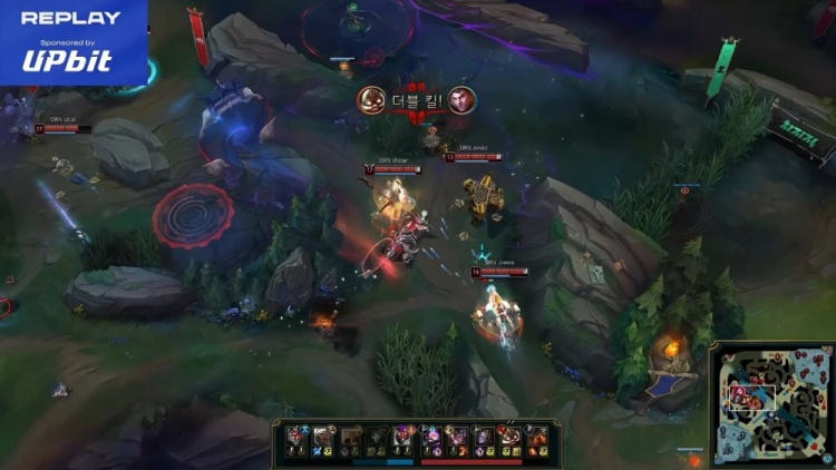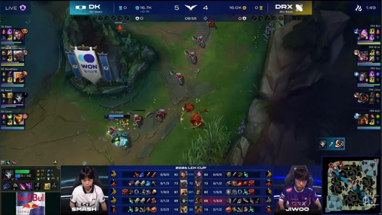 [16:49]Lucid安蓓萨入侵DRX石头人被逮捕,Andil泰坦点火吃掉人头,随后Siwoo杰斯下路推塔被DRX下野二人击杀,双方经济持平。