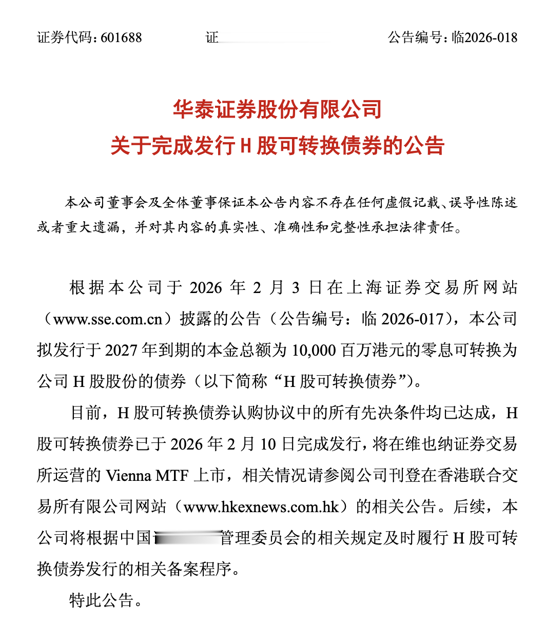 2026年2月10日晚间,华泰证券(601688)发布公告,总额100亿港元的H股零息可转换债券已完成交割,将在维也纳证券交易所ViennaMTF挂牌上市。