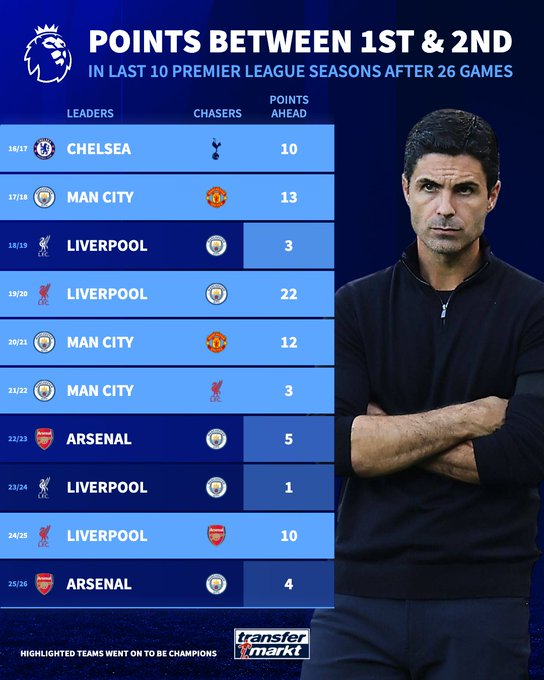 虎扑02月13日讯德转盘点了过去10个英超赛季,在26轮比赛后领先者与追赶者之间的积分差距,并标出最终成为冠军的球队。