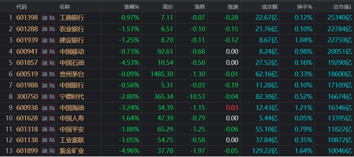 注:万亿市值股今日集体收跌(截至2月13日收盘)