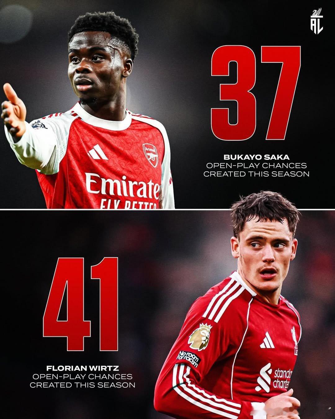 本赛季利物浦有三名球员跻身创造运动战机会次数前十,其中维尔茨创造了 41 次机会,分别是维尔茨 萨拉赫 加克波 而阿森纳的萨卡则创造了 37 次机会!