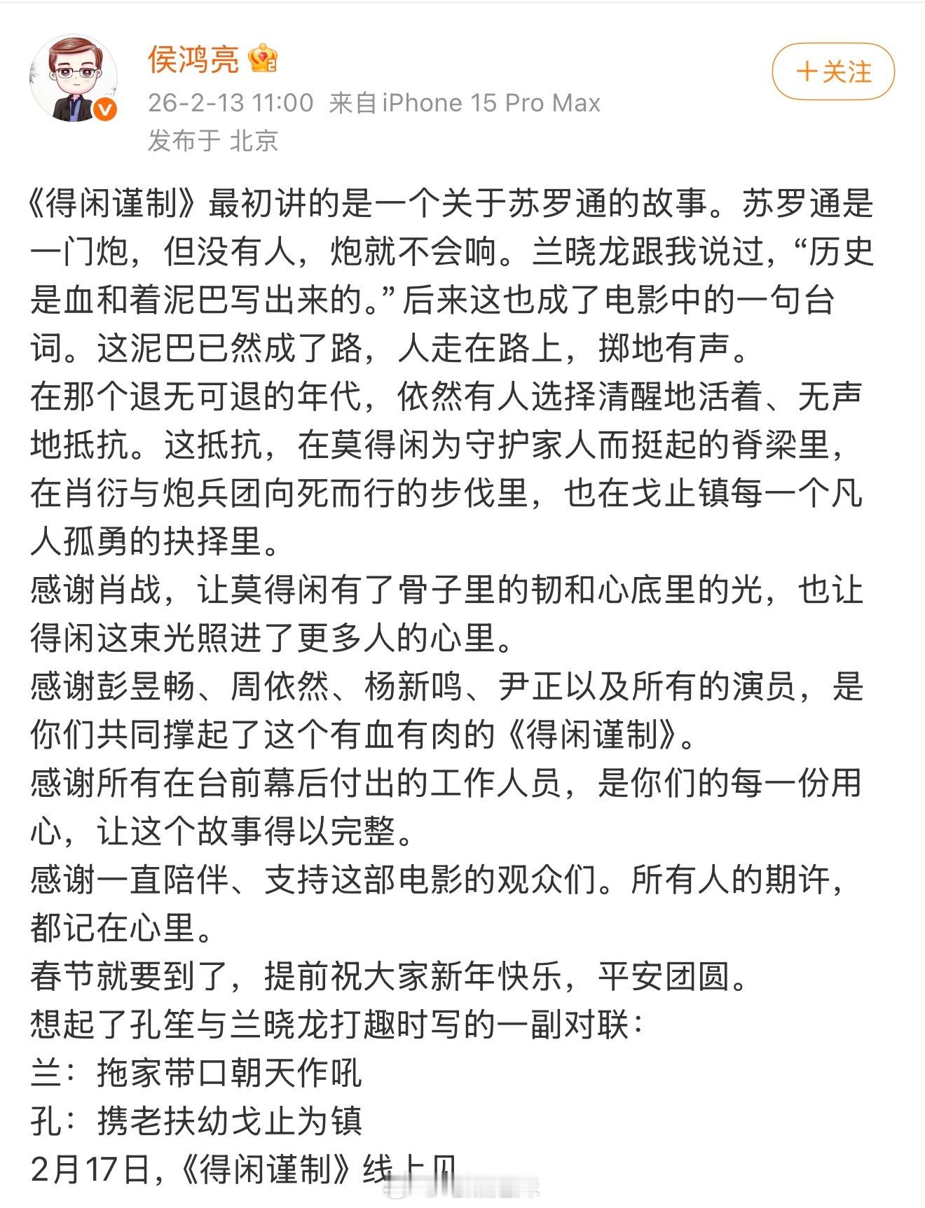肖战回复侯鸿亮肖战回复侯鸿亮的长文:感谢侯总、孔导和兰老师。戈止镇的故事马上就要和更多的观众朋友们见面了,希望大家喜欢。