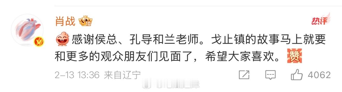 肖战回复侯鸿亮肖战回复侯鸿亮的长文:感谢侯总、孔导和兰老师。戈止镇的故事马上就要