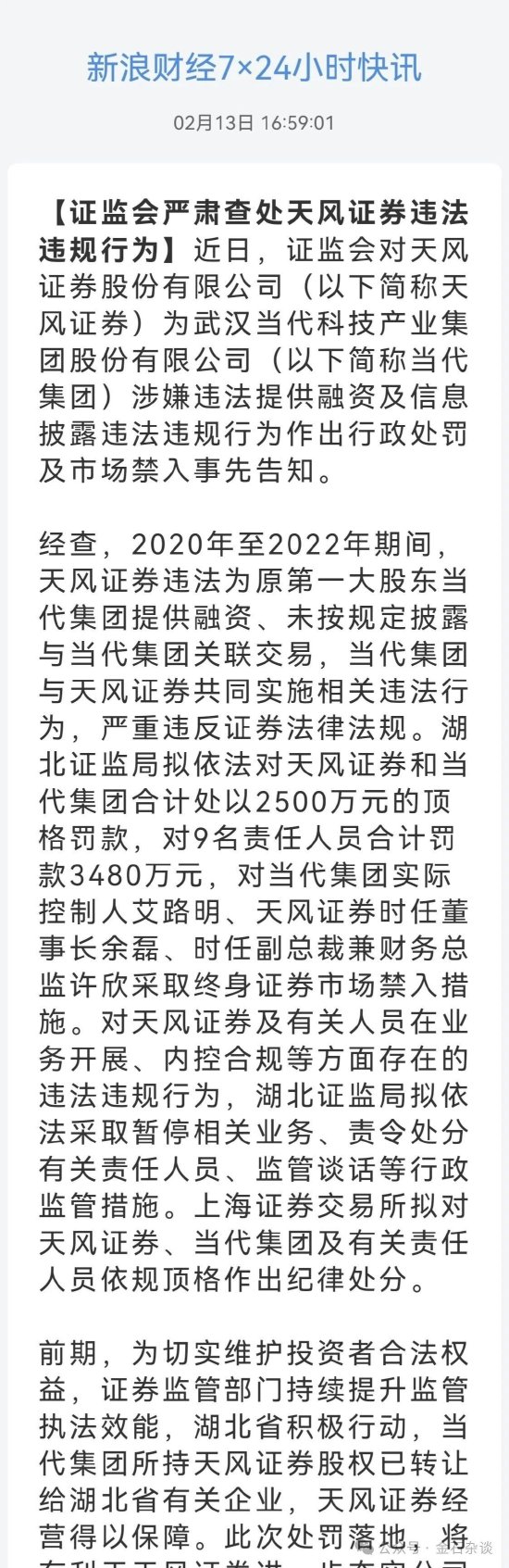湖北证监局拟依法对天风证券和当代集团合计处以2500万元的顶格罚款,对9名责任人员合计罚款3480万元,对当代集团实际控制人艾路明、天风证券时任董事长余磊、时任副总裁兼财务总监许欣采取终身证券市场禁入措施。