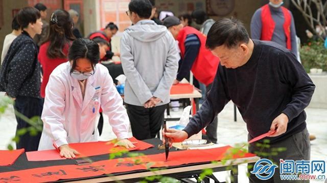 活动现场暖意融融、墨韵飞扬。来自泉州老年大学的书法爱好者们凝神聚气、挥毫泼墨,一笔一画尽显笔墨神韵。红纸舒展、墨香满溢,一副副寓意吉祥、对仗工整的春联应声而成,一个个饱满厚重、气韵生动的“福”字跃然纸上,既有恭贺新春的美好祝愿,也有致敬医者的暖心寄语,将传统文化之美与新春祝福融为一体。