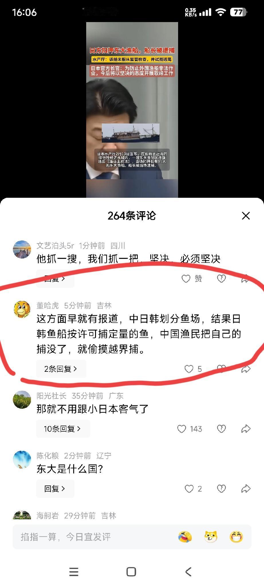 日方非法扣押中国渔船 这个网友身为中国人,居然助纣为虐往中国渔民身上泼脏水。 他说:中日韩划分鱼场,结果日韩鱼船按许可捕定量的鱼,中国渔民把自己的捕没了,就偷摸越界捕。 这事必须说清楚,日方4艘船只围堵中国渔船,是刻意挑衅,事发海域部分属于中日“暂定措施水域”,日方单方面主张专属经济区并执法,我国并不承认其合法性。 中国渔民是在海上合法捕捞,并不是这个网友说的偷摸越界捕捞。 海域主张 :中方不承认日方在该海域单方面划设的“专属经济区”。 这个网友如此胡言乱语,助纣为虐实属不应该,也希望平台加强管理,不能让这些造谣者妖言惑众。