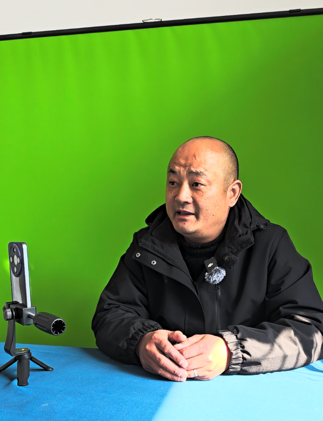 在胡村村两委办公楼的二楼,有一间办公室布置成了直播间。办公桌上铺着一张蓝桌布,墙上挂着绿色的背景布,旁边还有一架灯光设备。“临近春节比较忙,之前时不时会在这里搞直播。”罗庆介绍,他一般会选在傍晚五六点钟进行直播,在村里,那时候是村民们吃晚饭的时间,也是人们喜欢玩手机的时间,直播间里,他一般会宣讲与村民们息息相关的政策,发布一些最新的重要通知。
