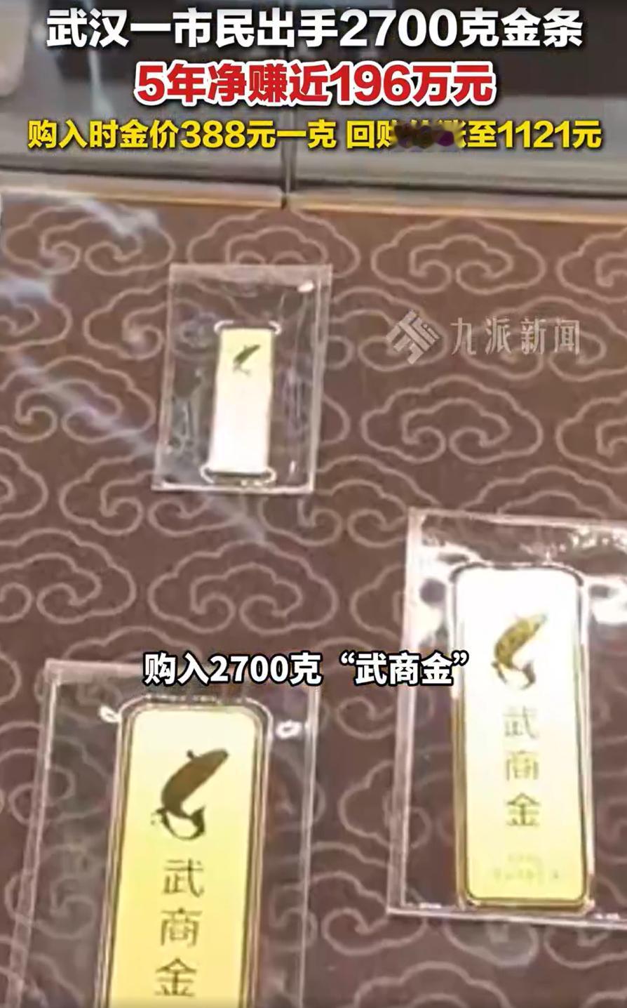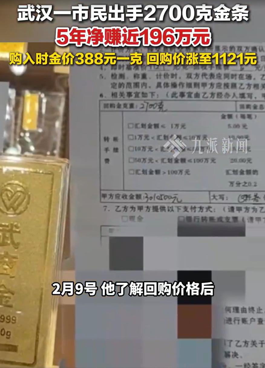 这真是有钱任性!湖北武汉,一男子拿着2700克金条到店里回购,而这些金条已经在男子手里存放了5年之久,当初买的时候花了105万,一直都没想着出售,这次卖出后净赚近196万 男子介绍,五年前花105万买了堆金条,后来往保险柜一扔,差点自己都忘了这事。最近看到金价上涨很热闹,他才想起来自己还有这茬。拿去一回购,到手301万 2021年,黄金价格每克388块5。他出手就是2700克,一百零五万。当时很多人不理解,花一百多万买一堆沉甸甸的黄疙瘩,又不能吃又不能喝,图什么。他没解释,买完就往家里一放 五年里,黄金价格起起落落,他也没动过卖的念头。直到今年这波行情起来,金价一路冲破1100元关口。2月9号,他去了武汉一家商场,当天的回购价是每克1121块,扣掉6块手续费,到手1115块一克。2700克,总计301万 五年前那笔105万,变成301万。这196万,你说他是赚了差价,还是赚了耐心? 黄金还是那个黄金,五年没变过样。变的是人心。前几年金价低迷时,多少人割肉离场;今年涨疯了,又多少人追高进场。他只是在中间,什么都没做 我觉得,这件事有意思的地方,不在于他眼光多准,而在于他忘性挺大。金条买回来往保险柜一塞,没天天盯着大盘算涨了多少,也没因为哪个专家说黄金要跌就慌着出手 他不折腾,钱反而自己找上门 现在很多人投资,太忙了。盯K线,听消息,算波段,今天买明天卖,手续费交了一轮又一轮,账户却没见多多少。一顿操作猛如虎,回头一看,不如那个买了就忘的人