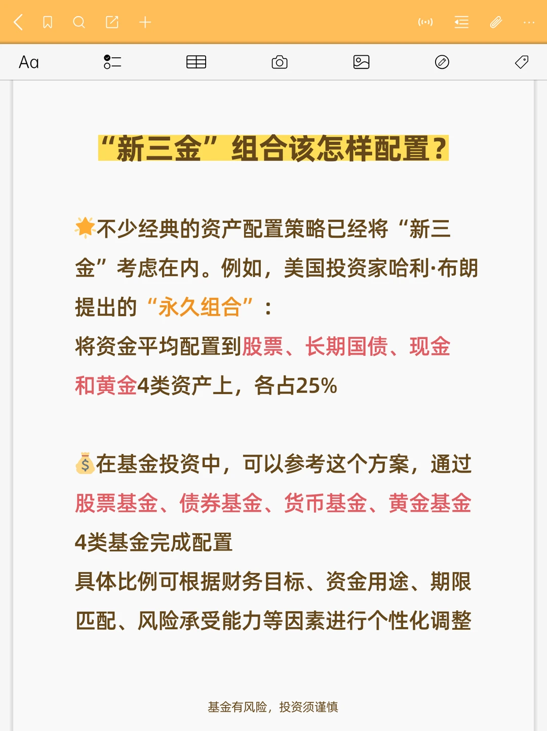 📊在基金投资中,可以参考这个方案,通过✅股票基金、✅债券基金、✅货币基金、✅黄金基金4类基金完成配置