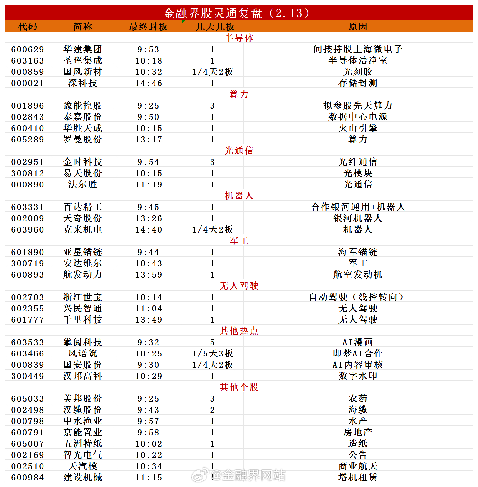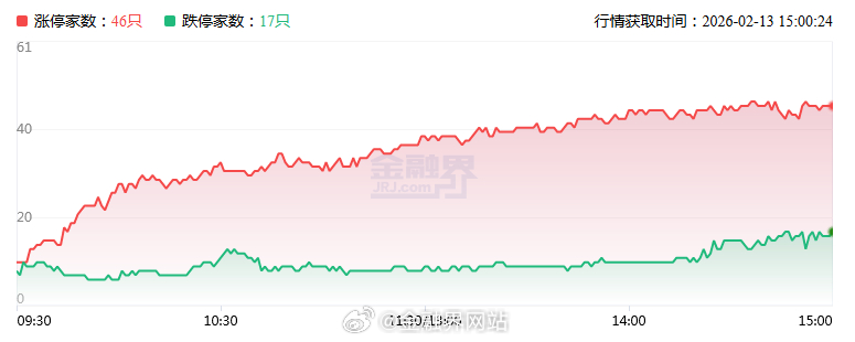 【涨停复盘:今日全市场共46只股涨停,连板股总数5只,半导体板块国风新材、圣晖集成涨停!】 2月13日A股长假前最后一个交易日,三大指数集体回调,沪指跌1.26%,深成指跌1.28%,创业板指跌1.57%,沪深京成交额19991亿,较昨日缩量1619亿。板块上,军工、半导体(光刻机、光刻胶、设备)、造纸涨幅居前,港口航运下跌。全市场32股涨停,连板5只,封板率74%,掌阅科技5连板为市场高度板,豫能控股等3连板。相关热点:具身智能未来或热度更高;华为云代码智能体开启万人公测;我国新型3D打印技术刷新速度纪录;AI算力催生电力需求,核聚变行业资本开支上行,美国初创企业融资4.5亿美元开发激光聚变发电厂。详情:涨停复盘:今日全市场共46只股涨停,连板股总数5只,半导体板块国风新材、圣晖集成涨停!