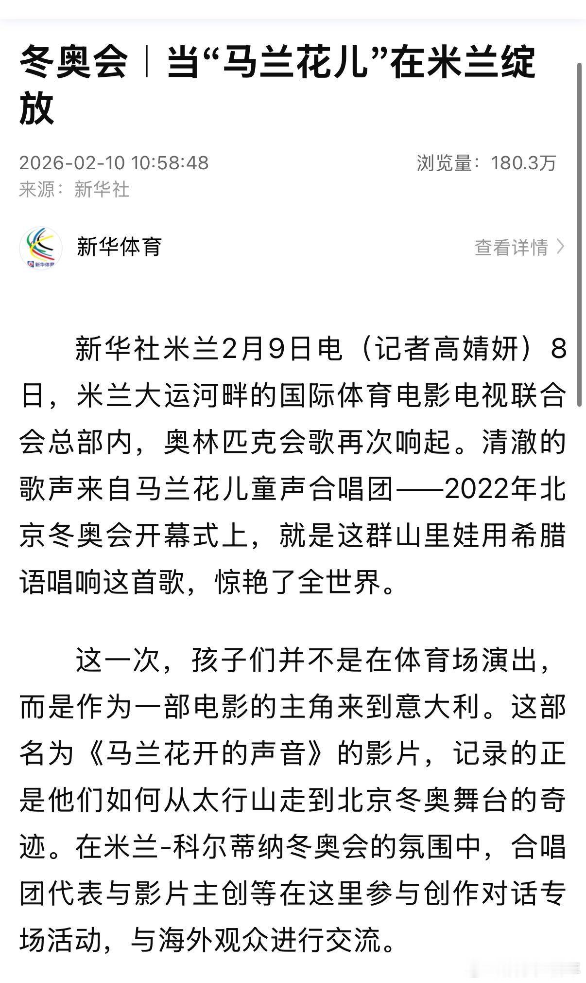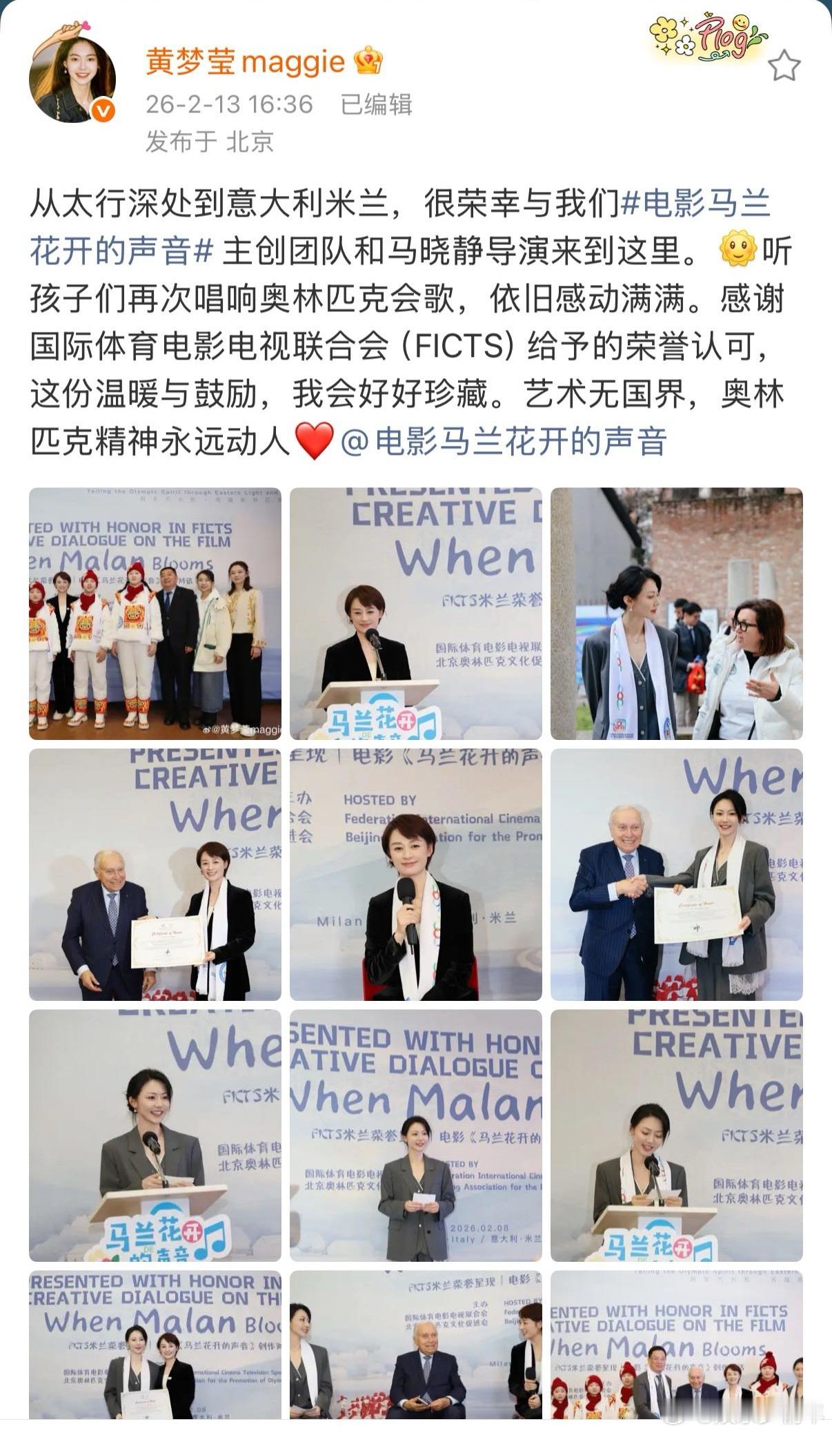电影马兰花开的声音及主创在米兰获“国际体育精神传播奖”,导演马晓静与主演黄梦莹共同见证荣耀,用作品诠释冬奥温度,让世界看见中国力量。