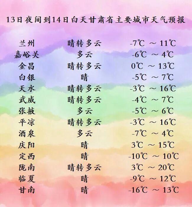明天夜间到后天白天(2月14日20时-2月15日20时),酒泉、嘉峪关、甘南、临夏、定西、陇南、天水、平凉等市州多云转阴,局部地方有小雪(雨)或雨夹雪;省内其余地方晴或多云。另外,酒泉市有4-5级偏东风,局部地方有沙尘。