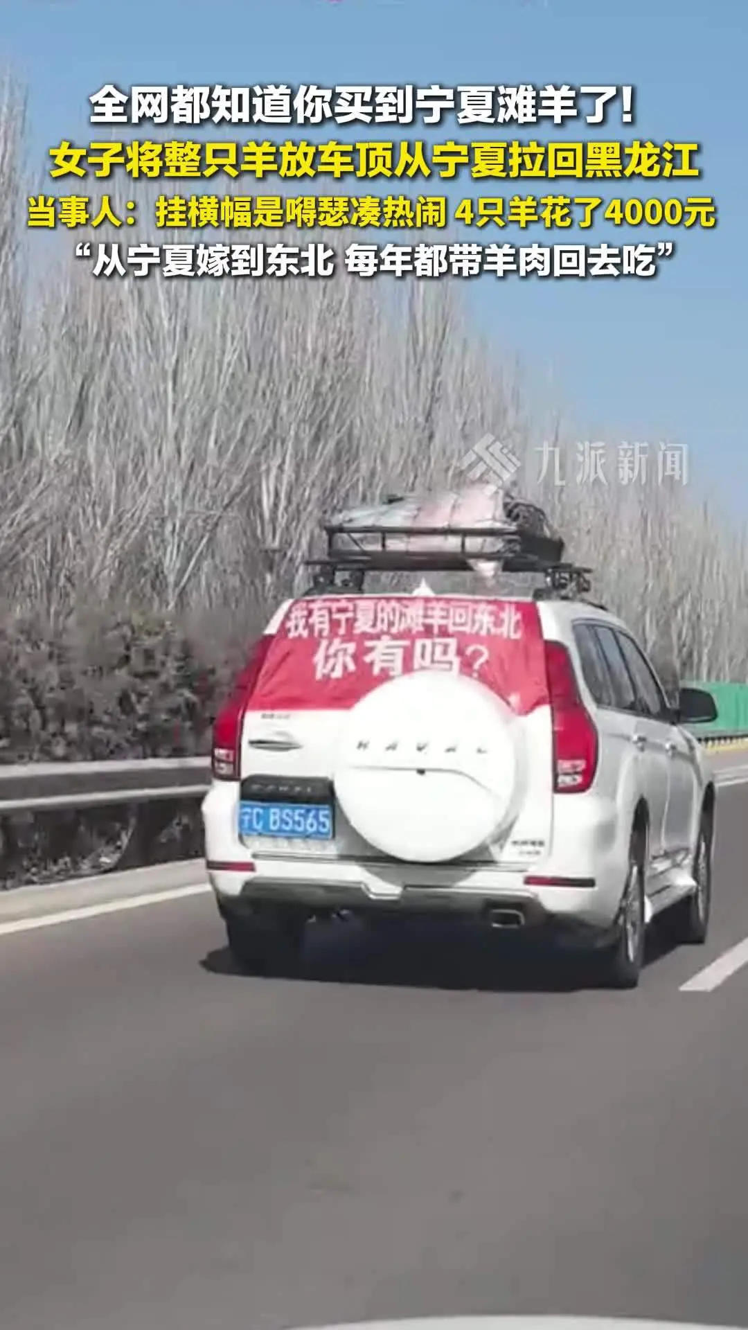 这可不是什么行为艺术,也不是短视频摆拍,而是一个宁夏媳妇嫁到东北后,每年雷打不动的“甜蜜任务”。姜女士这次和妹妹一家从宁夏采购了4只滩羊,为了“显摆”一下家乡的好味道,特意把一只绑在车顶,还挂了横幅凑热闹。全程一天一夜,羊没叫,人没累,网友却看“馋”了。