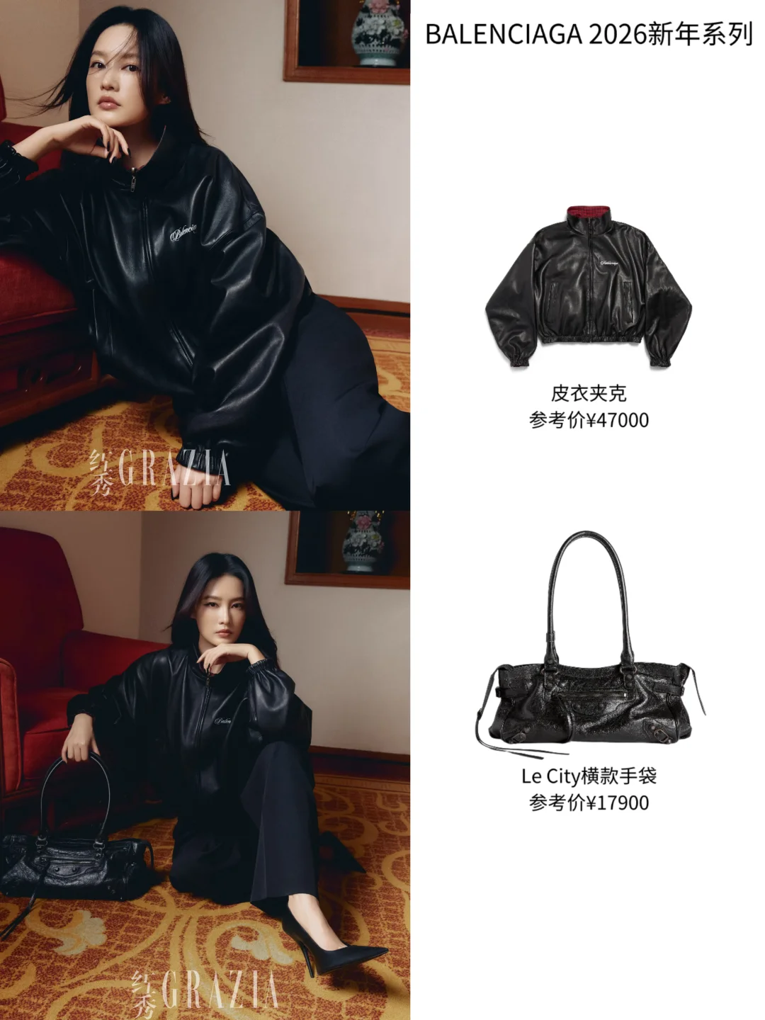 李沁登上《红秀》杂志时,也演绎了同款,不同于杨超越的甜酷范儿,李沁则是温柔中带了点飒气与叛逆,搭配起上挑眼线的造型来细细品味,真是恰到好处;另一套穿了皮衣夹克,简单的字母logo设计,低调中自带静奢之感,内衬还是红色格纹,一些小细节上的精雕细琢,一眼心动,同时搭配利落西裤与尖头高跟,真霸气大女人气场,气场全开!还背了一只Le City First包袋,柔软细腻的羊皮革质感,随性又松弛,别出心裁的横款设计,简约高级中更显格调