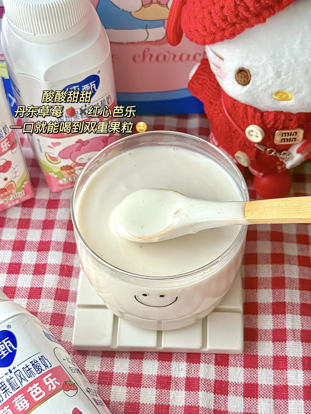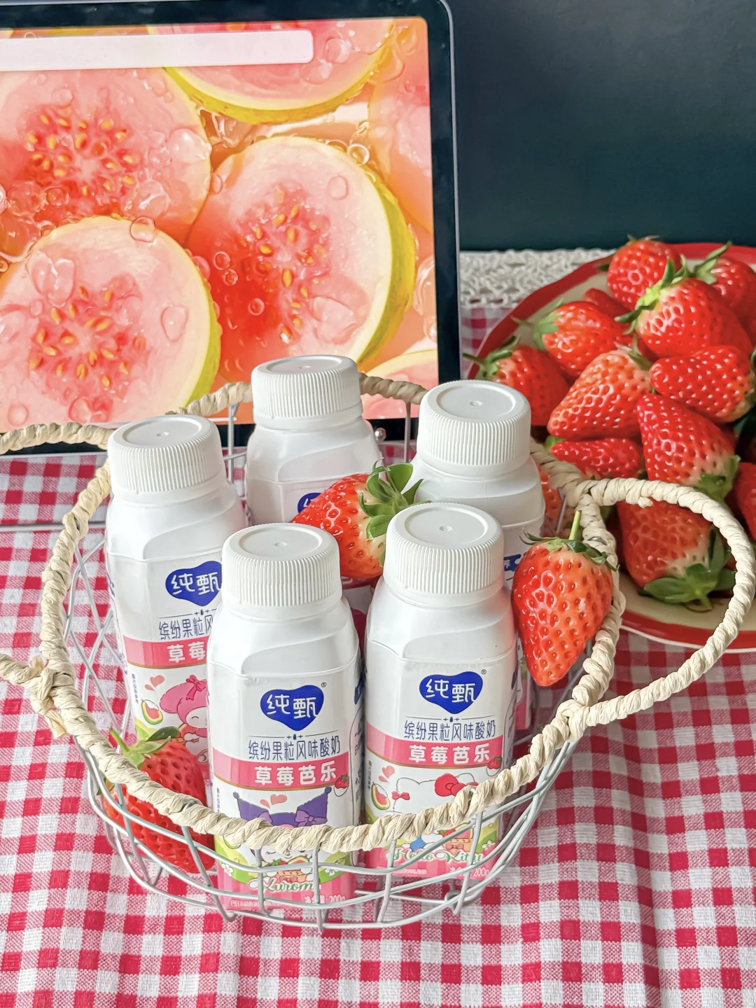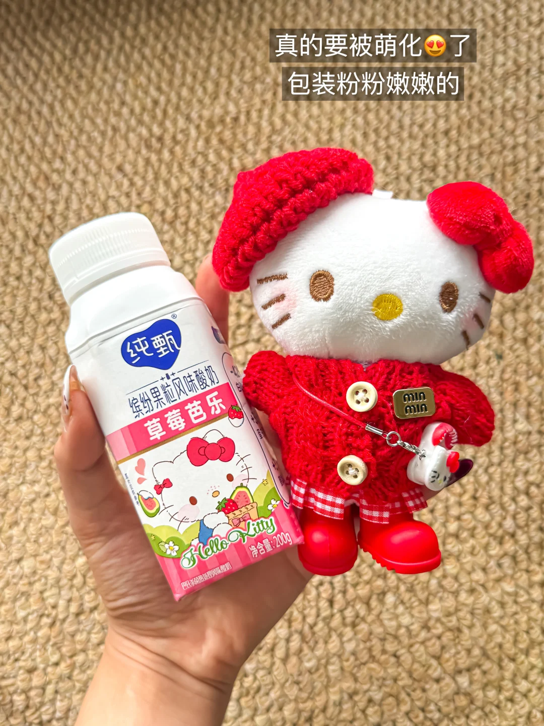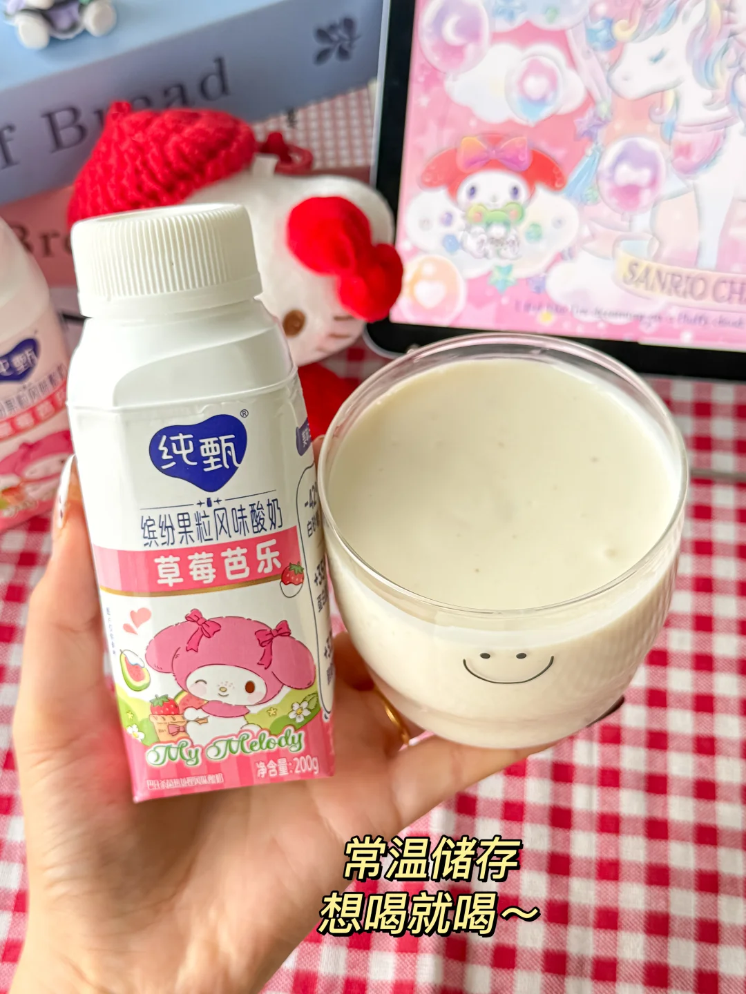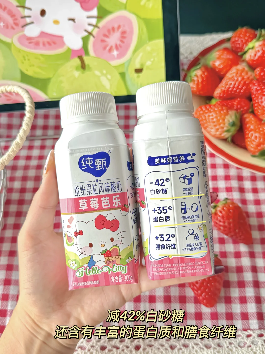 救命!姐妹们看我发现了什么!!! 我超爱的纯甄草莓芭乐酸奶竟然和三丽鸥正版联名啦! 有Hello Kitty/ 酷洛米/美乐蒂三款限定包装瓶身 真的要被萌化🥰啦,整体是粉粉嫩嫩的,摆在桌子上超治愈~ 每一款都好想做成小卡片收藏起来~ 🍓草莓芭乐口味,hin浓郁的果香 酸酸甜甜的,一口就能喝到草莓和芭乐双重果粒~ 口感丰富的同时又清新解腻 减42%白砂糖,还含有丰富的蛋白质和膳食纤维 营养又好喝~当早餐还是加餐都可以!准备再买几箱送给闺蜜😁😁