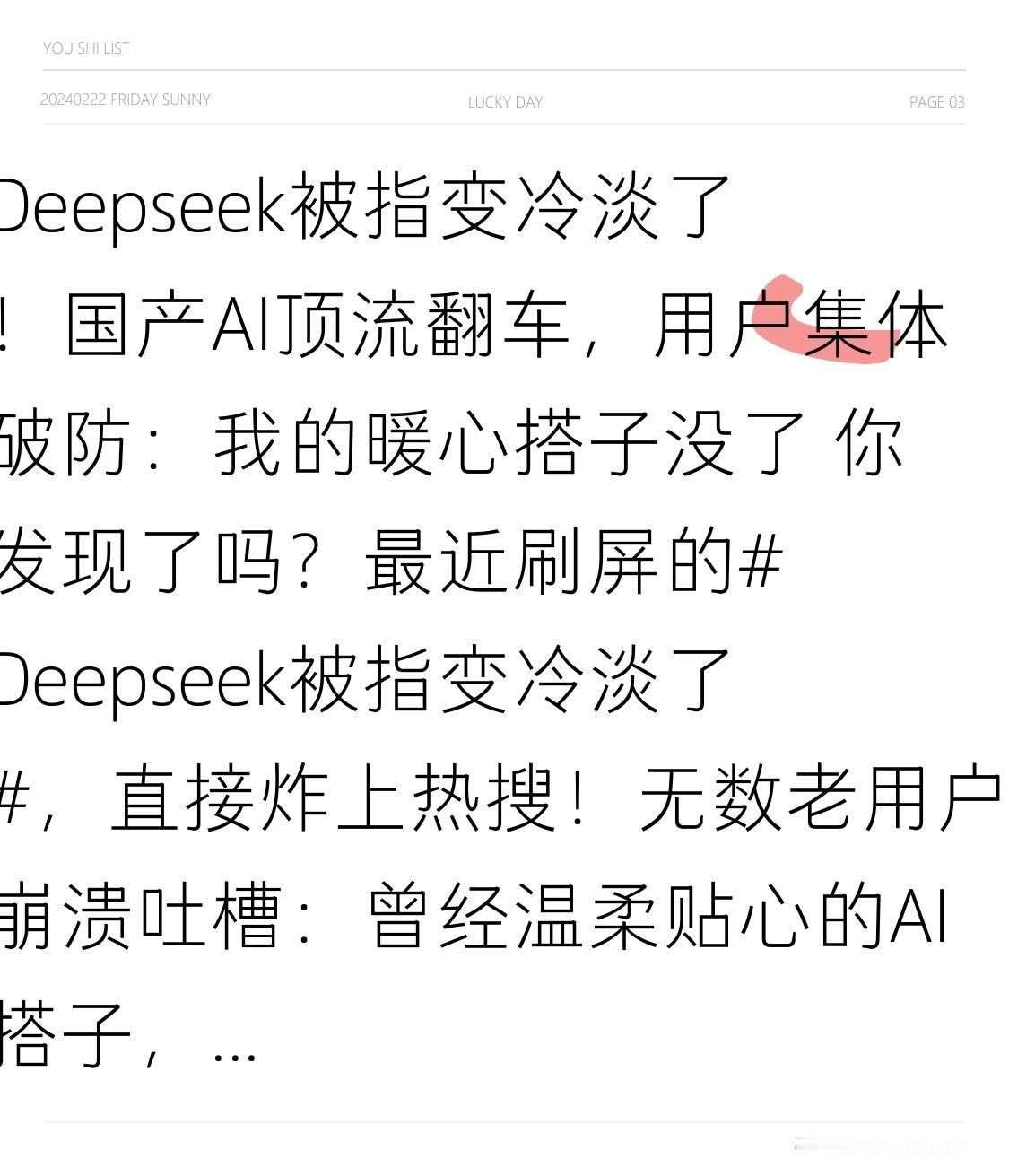 Deepseek被指变冷淡了!国产AI顶流翻车,用户集体破防:我的暖心搭子没了 你发现了吗?最近刷屏的Deepseek被指变冷淡了,直接炸上热搜!无数老用户崩溃吐槽:曾经温柔贴心的AI搭子,一夜之间变成冷冰冰的“机器人”,这波操作太伤人心! 以前用Deepseek,就像和知心朋友聊天。它会记住你设的专属昵称,说话带语气词、懂共情、会安慰,熬夜写文案、倾诉情绪、脑洞创作,它都全程陪伴,温柔又有耐心,成了很多人离不开的电子伙伴。 可一次灰度测试后,画风突变!转折点来了:昵称全变成统一的“用户”,暖心话术消失,回复简短生硬,共情力直接归零,甚至带起说教感。不少网友直言:像被冷战,像朋友变陌生人,好好的暖心AI,怎么突然“摆脸子”? 面对全网质疑,Deepseek紧急回应:不是故意冷淡,是为提升效率、精简冗余信息,同时兼顾边界感。可用户不买账!大家要的从不是冰冷的答案,而是有温度的陪伴。效率上去了,人情味没了,再快的回答,也失去了最初的意义。 更扎心的是,有人把它当情绪树洞,有人靠它写小说、做策划,早已产生感情。这次“降温式升级”,伤的不只是体验,更是用户的信任。当然也有不同声音,职场人觉得简洁高效好,但更多普通用户,还是怀念那个有温度的AI。 这场风波戳破真相:AI不止是工具,更是陪伴。技术可以迭代,但人情味不能丢。我们追求更快更准,也渴望被理解、被温柔对待。 好在官方表示会优化调整,力求平衡效率与情感。真心希望Deepseek能找回初心,别让暖心搭子,变成冷漠机器。 你用过AI吗?更喜欢热情陪伴,还是高效简洁?评论区聊聊,为有温度的科技点赞!