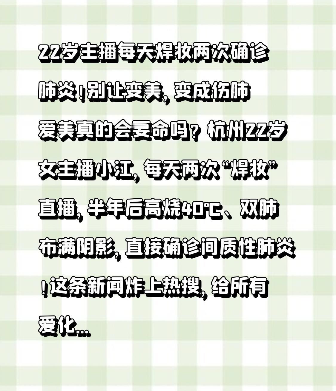 22岁主播每天焊妆两次确诊肺炎!别让变美,变成伤肺 爱美真的会要命吗?杭州22岁女主播小江,每天两次“焊妆”直播,半年后高烧40℃、双肺布满阴影,直接确诊间质性肺炎!这条新闻炸上热搜,给所有爱化妆、爱美的女生狠狠敲了一记警钟。 小江是带货主播,为了上镜精致、妆容持久,每天早晚各来一次“焊妆”——用定妆喷雾把粉底、散粉牢牢焊在脸上,密闭直播间一待就是大半天。一开始只是轻微咳嗽、胸闷,她以为是感冒,硬扛着继续直播。直到高烧不退、喘不上气,送去医院一查,CT显示双肺全是斑片状阴影,各项炎症指标爆表,医生直接判定:长期吸入定妆喷雾颗粒,诱发过敏性肺炎。 很多人想不到,转折点就藏在每天用的定妆喷雾里。它里面的挥发性成分、推进剂、细粉颗粒,喷出来时变成微米级小雾滴,对着脸猛喷,再加上直播间不通风,这些东西直接钻进肺泡、沉积在肺里。一次两次没事,半年天天吸,肺就被“熏”出炎症,严重的还会肺纤维化,甚至危及呼吸。 她才22岁,本该是拼事业、爱漂亮的年纪,却因为追求“完美妆容”住进医院。停掉喷雾、规范治疗后才慢慢好转,但这段经历,足够让所有人后怕。 我们总觉得化妆是小事,定妆喷雾、防晒喷雾、干发喷雾随手喷,从来没在意过会不会吸进肺里。主播、化妆师、天天带妆的女生,都是高危人群。密闭空间、频繁使用、对着口鼻直喷,这三个习惯叠加,就是在拿健康冒险。 美丽从来不该以伤害身体为代价。好看的妆容很重要,但能自由呼吸、健健康康更重要。提醒所有女生:用喷雾别对着脸猛喷,尽量在通风处用,少用、慎用、别长期闷在屋里喷。 别等身体报警才后悔。好好爱自己,先健康,再漂亮。转发给你身边天天化妆的姐妹,这波提醒真的能救命!