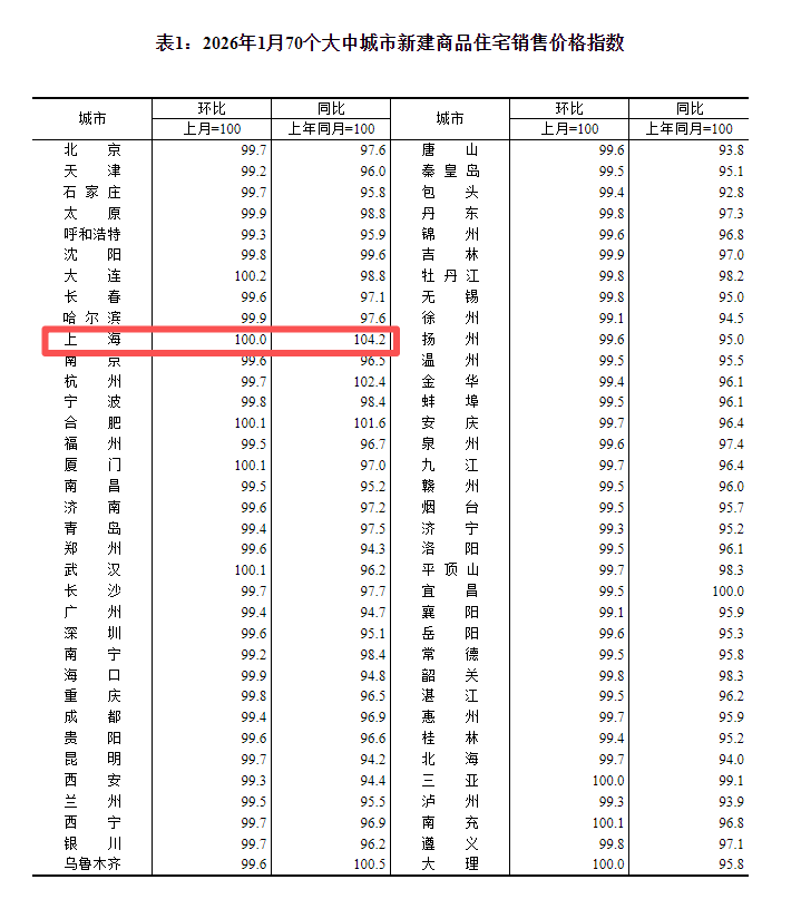 在众多城市中,上海一直是全国新房价格的领头羊,此前价格指数已连续43个月环比上涨。不过,今年1月份,这一势头并未延续,新房价格环比持平。