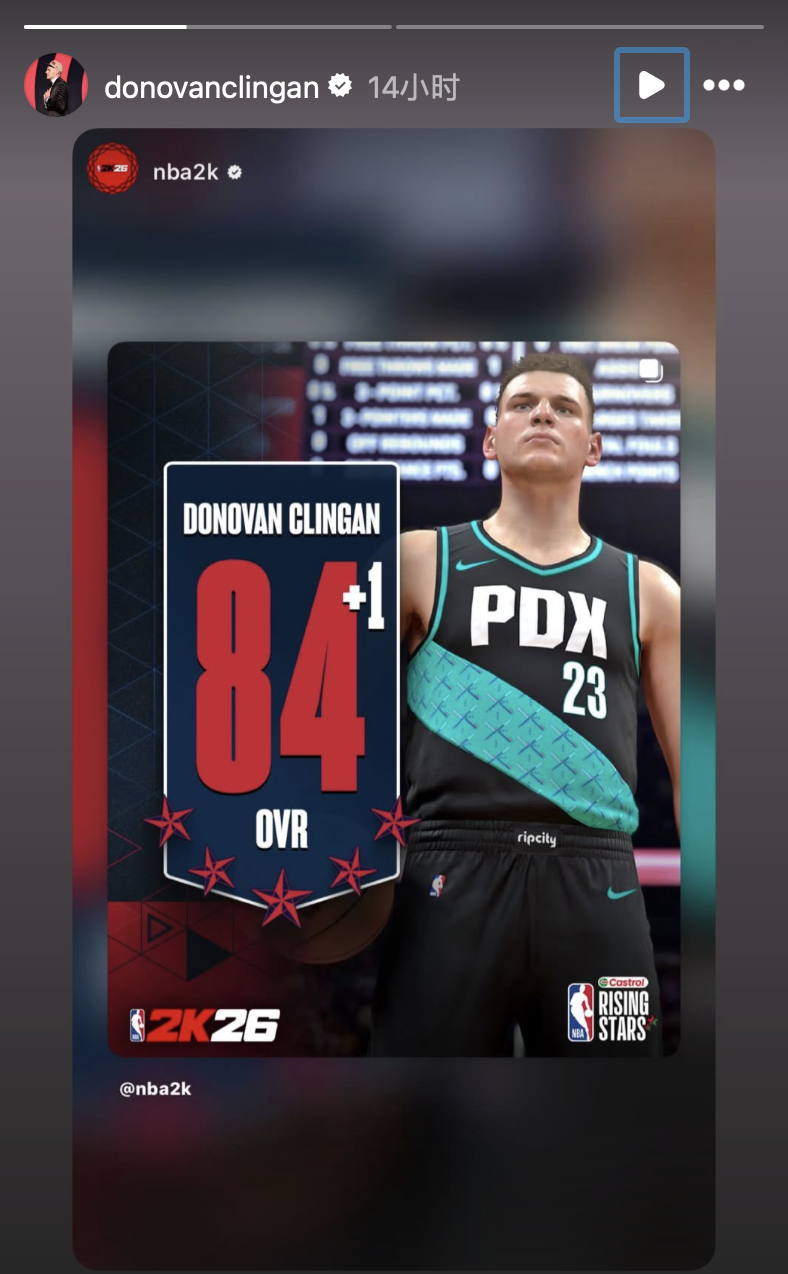 虎扑02月13日讯开拓者球员多诺万-克林根更新Ins,晒出一张自己2K26的形象照与球迷分享。