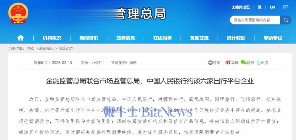 2月13日,据国家金融监督管理总局,近日,金融监管总局联合市场监管总局、中国人民银行,对携程旅行、高德地图、同程旅行、飞猪旅行、航旅纵横、去哪儿旅行等六家出行平台企业进行约谈。