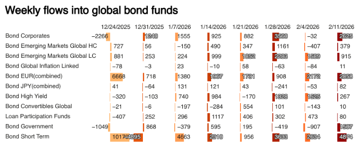 截至2月11日当周,欧洲和亚洲股票基金资金强劲流入,投资者因担忧估值过高和人工智能相关支出不断增长而减持美国大型股。LSEGLipper数据显示,全球股票基金连续第五周净流入,资金总额达255.4亿美元,其中欧洲基金净流入175.3亿美元,创下至少自2022年以来单周最高纪录;亚洲基金净流入约62.8亿美元。与此同时,美国股票基金当周净流出14.2亿美元,这是三周以来的首次净流出。