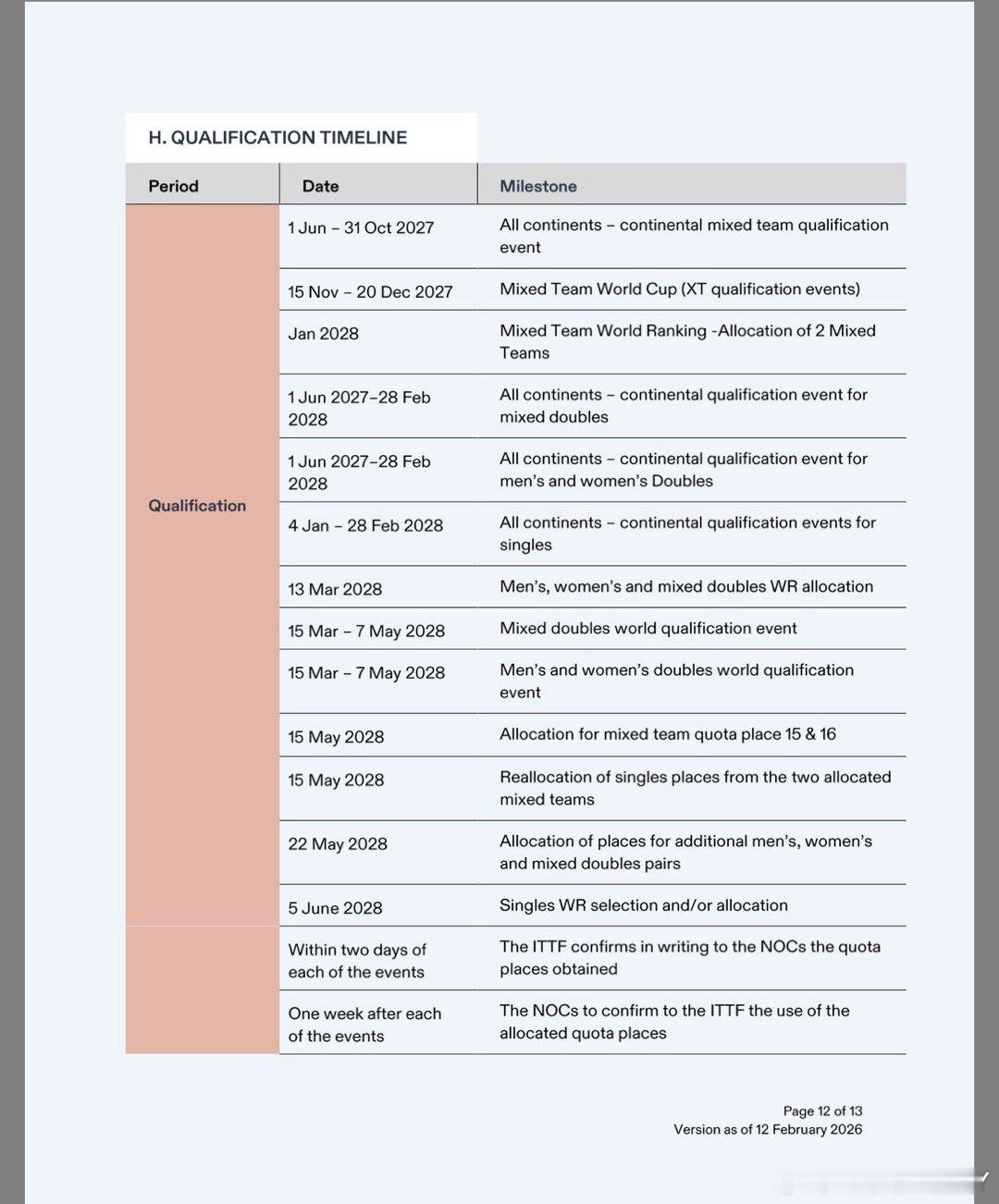 最终节点2028年6月15日ITTF重新分配所有未使用的名额2028年6月26日2028年洛杉矶奥运会 体育项目报名截止日期