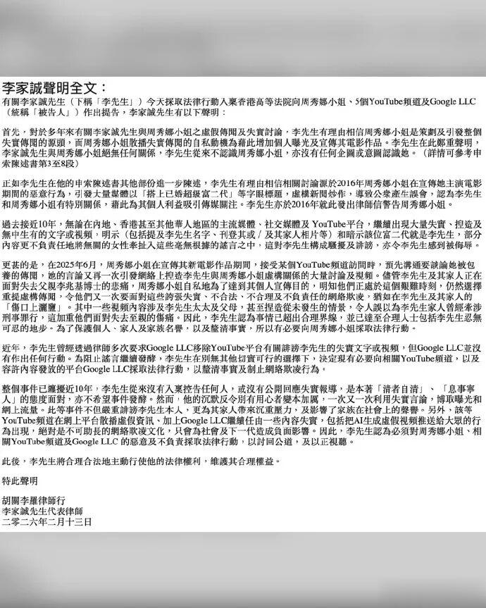 李家诚在声明中表示,此次采取法律行动,是为了厘清事实及保护个人及家族名誉。