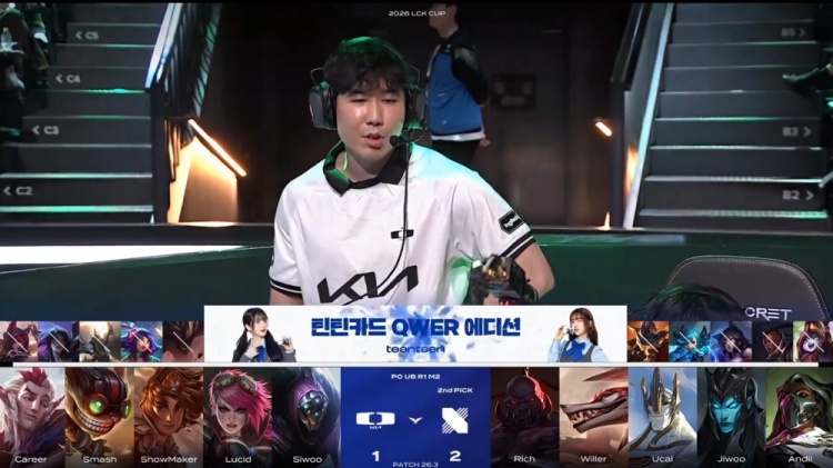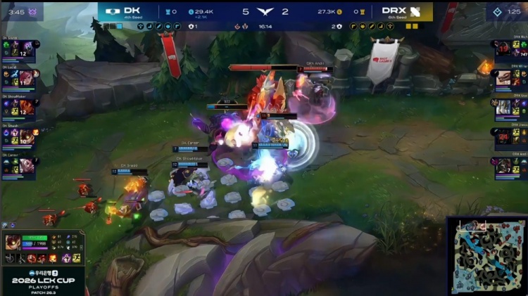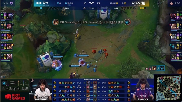 [5:17]小龙团,许哥岩雀封路,Lucid蔚抢掉小龙,Career洛补掉Andil烈娜塔拿到一血,Jiwoo卡莉丝塔难逃一死被Smash吉格斯击杀,DK打出0换2,经济领先1.4k。