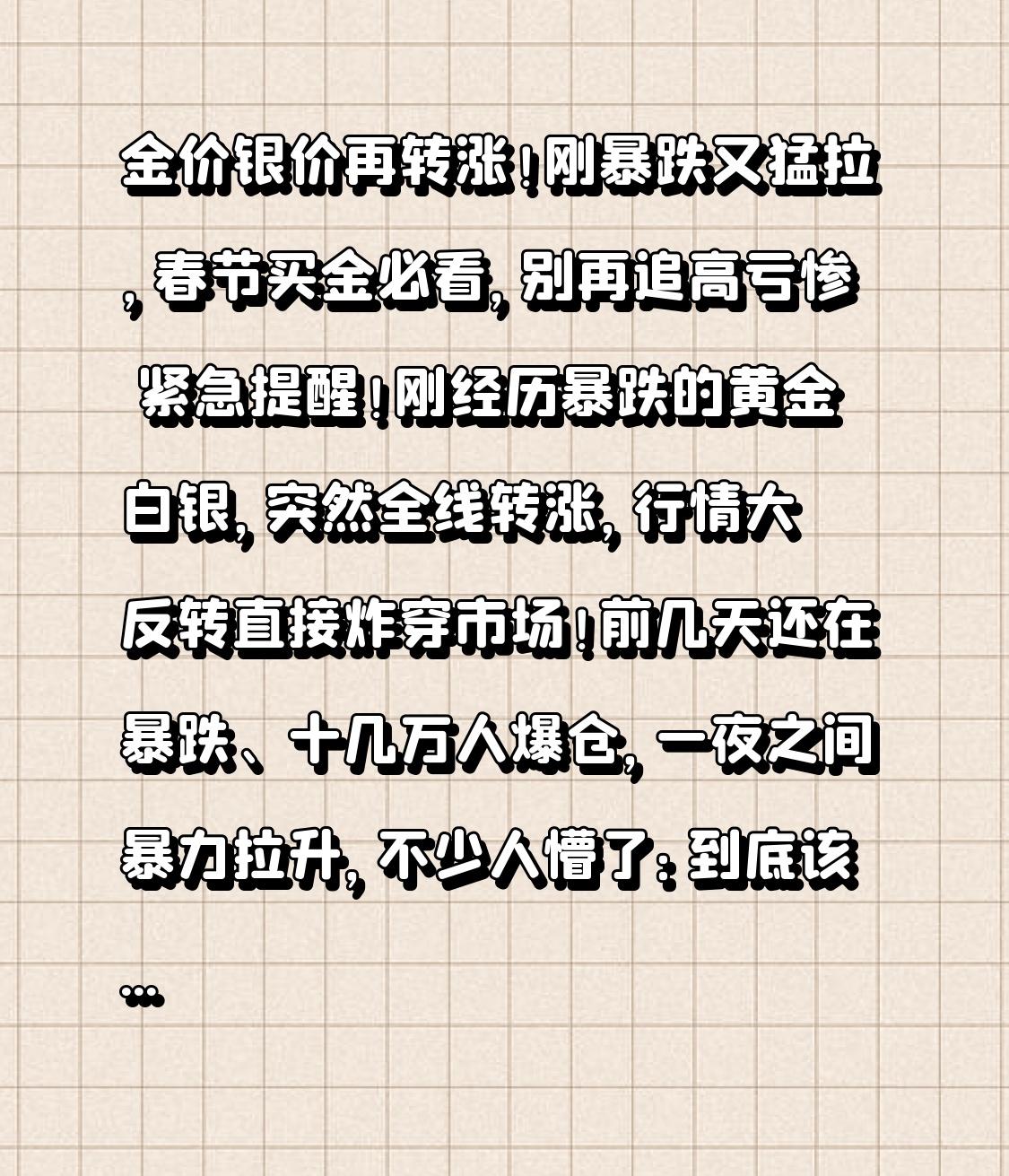 金价银价再转涨!刚暴跌又猛拉,春节买金必看,别再追高亏惨 紧急提醒!刚经历暴跌的黄金白银,突然全线转涨,行情大反转直接炸穿市场!前几天还在暴跌、十几万人爆仓,一夜之间暴力拉升,不少人懵了:到底该抄底还是赶紧跑? 就在几天前,金银价格大幅跳水,白银单日暴跌超10%,全球超14万投资者爆仓,32亿资金瞬间蒸发,金店零售价也跟着回落,很多人吓得割肉离场,以为牛市彻底结束。 转折点来了!受地缘局势、降息预期升温,加上春节备婚、送礼需求爆发,金银强势反弹,国际金价站稳4900美元上方,白银单日暴涨超4%,国内金店足金价格重回1550元/克以上,期货市场同步拉升,暴跌后直接V型反转。 这波上涨,有人欢喜有人愁。抄到底的赚得盆满钵满,割肉的拍断大腿,还没买的更是纠结:春节想囤金饰、买金条,现在上车会不会接盘? 其实真相很扎心:黄金是避险资产,不是投机工具!白银波动更大,受工业与金融属性双重影响,涨跌都比黄金猛。普通家庭买金,别盯着短期涨跌赌行情,备婚、送礼、长期保值按需入手,别被暴涨暴跌带偏。 春节前金银需求旺盛,价格易涨难跌,但波动风险也在。机构预测,中期金银牛市逻辑未破,可短期震荡依旧剧烈,盲目追高很容易被套。 别再被“一夜暴富”忽悠,也别因暴跌恐慌割肉。买金量力而行,首饰看喜欢,投资选金条,远离高杠杆期货,守住本金比赚快钱更重要。 2026年春节,愿大家理性买金不踩坑,稳稳守住自己的财富!你最近买黄金了吗?评论区聊聊你的看法!