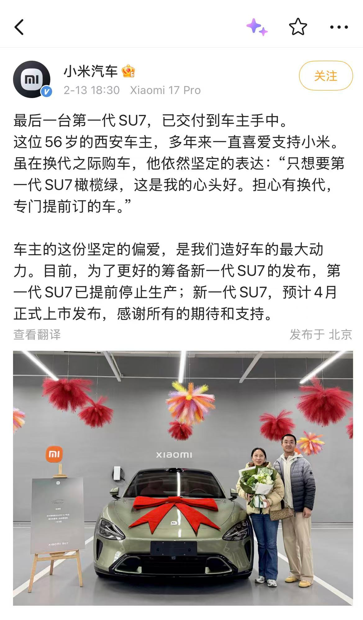 2月13日,小米汽车在官方微博发帖宣布,最后一台第一代SU7,已交付到车主手中。这位56岁的西安车主,多年来一直喜爱支持小米。虽在换代之际购车,他依然坚定的表达:“只想要第一代SU7橄榄绿,这是我的心头好。担心有换代,专门提前订的车。”