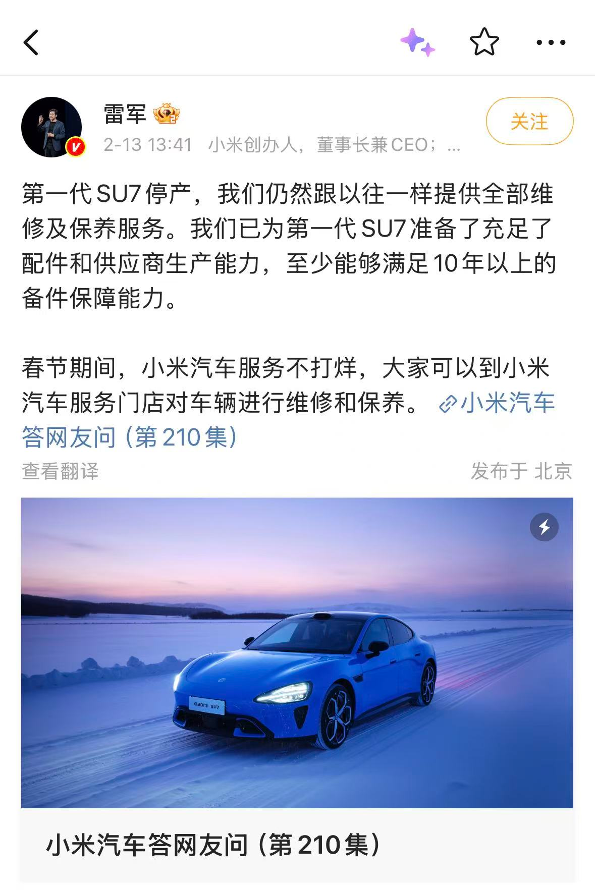 当日稍早,小米CEO兼董事长雷军在微博称,第一代SU7停产,我们仍然跟以往一样提供全部维修及保养服务。我们已为第一代SU7准备了充足了配件和供应商生产能力,至少能够满足10年以上的备件保障能力。春节期间,小米汽车服务不打烊,大家可以到小米汽车服务门店对车辆进行维修和保养。