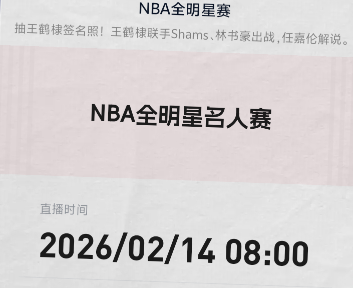 明早 2026NBA全明星周末迎来首日比赛8:00 NBA名人赛 华人双星同框:王鹤棣三度出战名人赛、林书豪重返全明星跨界梦幻联动:足球队长卡福、棒球巨星贝茨、NBA名记shams等诸多知名人士同场竞技。10:00 NBA新秀挑战赛青春风暴强势来袭 中国球员杨翰森出战2026nba全明星NBA我的观赛搭子