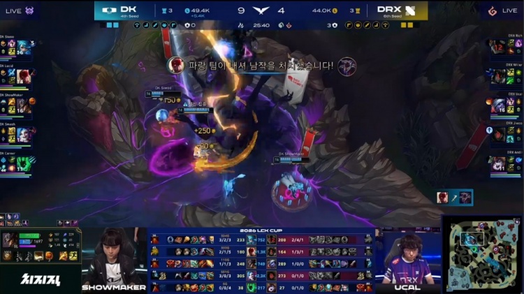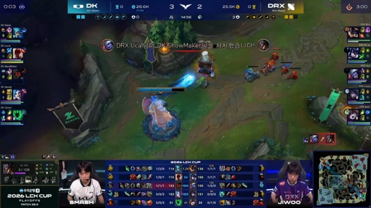 [24:58]DK入侵DRX野区,Smash金克丝启动双杀,Lucid盲僧踢飞Jiwoo厄斐琉斯,DK打出0换3吃掉大龙,经济领先6k。