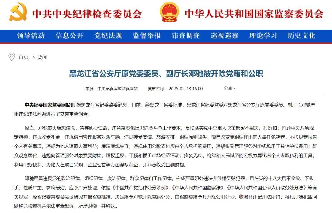 【曾负责扫黑除恶的“老刑侦”,栽在了“插手经济”上】各位老铁,今天聊个发生在北方的反腐通报。咱们虽然身处华南,但这种“警界蛀虫”的新闻,看了同样解气。 据中央纪委国家监委网站2月13日消息,黑龙江省公安厅原副厅长邓驰被“双开”并移送检察机关起诉。通报里有个细节特别扎眼:这位长期在刑侦战线工作、本该是“扫黑斗士”的副厅长,竟然违背常态化扫黑除恶斗争工作要求,而且擅自改变党组织的人事任免决定、干预和插手市场经济活动。 这邓驰可不是一般民警,他早年在省厅刑侦总队当总队长,2023年才坐上副厅长的位置,是个标准的“老刑侦”。可惜,业务能力强不代表党性修养高。从通报看,他不仅把手伸进了项目采购、企业经营这些敏感领域捞钱,甚至连人事任命都敢擅自更改,这不仅是违纪,简直是没把组织程序放在眼里。 为什么这条新闻值得咱们多看两眼? 因为这不是简单的“捞钱”问题。公安系统掌握着公权,如果连人事任命都能被个人篡改,如果连扫黑的人都去插手经济攫取利益,那基层的营商环境、治安环境能好吗?这次把他的涉案财物移送检察院,释放的信号很明确:不论是哪里来的“苍蝇”“老虎”,也不论你以前有过多少功劳,只要敢在核心纪律上“开口子”,敢利用公权力去干预市场,那结局就是晚节不保 。 看到这里,也想问问各位海南、广东的老哥:咱们自贸港建设最怕的就是这种“干预市场经济”的乱作为。在你看来,要怎样才能彻底管住某些干部想“插手”工程的这双手?欢迎在评论区聊聊你的看法。(图源:九派新闻截图)邓驰被双开 黑龙江公安厅原副厅长落马 曾负责扫黑除恶却干预市场经济 警界蛀虫插手工程采购被查 海南老铁看反腐 广东身边事 广西热点