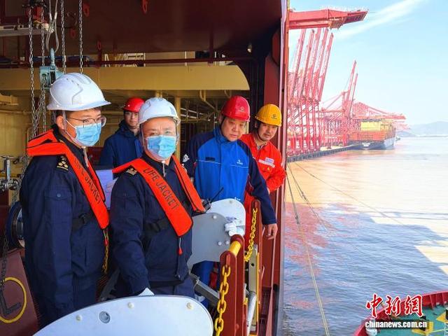 2月13日,宁波海关所属北仑海关关员正在现场监管保税LNG加注情况。吴梦凯摄
