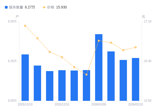 日期A股户数(户)流通A股户均持股数(股)户均持股市值(万元)2026-02-106270010661.8016.982026-01-306257910682.4116.882026-01-206311810591.1917.092026-01-096420710411.5616.902025-12-316194010792.6215.852025-12-196191410797.1516.232025-12-106192910794.5316.712025-11-286187710803.6116.982025-11-206222610743.0117.552025-11-106292610623.5117.96
