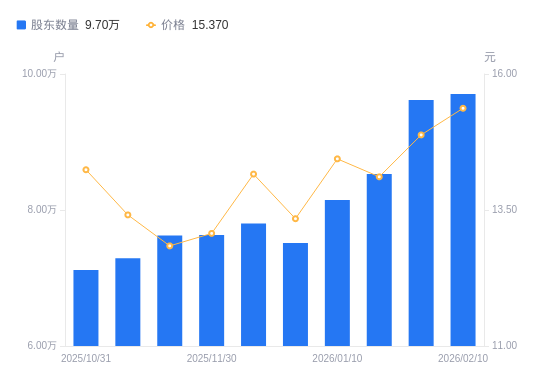 日期A股户数(户)流通A股户均持股数(股)户均持股市值(万元)2026-01-31961698081.0012.022026-01-20853129109.4112.852026-01-10814779538.1813.772025-12-207516410339.2813.792025-12-10780219960.6814.102025-11-307630810184.2813.312025-11-207625610191.2213.092025-11-107289110661.7014.302025-10-317119210916.1415.542025-10-207049511024.0714.86