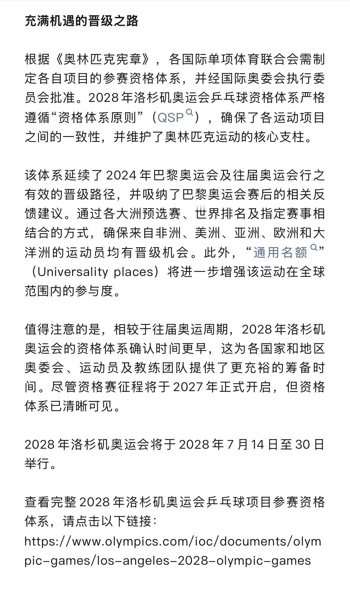 洛奥乒乓球参赛资格该如何获得 重点:在总人数不超过6人的前提下,各项目的具体名额分配如下:男、女单打:每协会最多男、女运动员各2名;男、女双打:每协会最多男双、女双各1对;混合双打:1对,最多2队。(如果该协会有2对组合混双世界排名均位列世界排名前8,且4人均在该协会6个名额之内,则可额外增加1对);混合团体:每协会最多1支队伍,由3男3女共6名运动员组成。届时,共有172名运动员(男、女各86名)将参与洛杉矶奥运会乒乓球项目的角逐,每个协会最多可派出的运动员总数为6人(男、女各最多三人)。网页链接