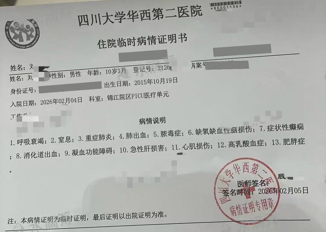 四川大学华西第二医院住院临时病情证明书显示,晓晨被送到医院时出现呼吸衰竭、窒息、重症肺炎、肺出血、脓毒症、缺氧缺血性脑损伤等共13项病症。