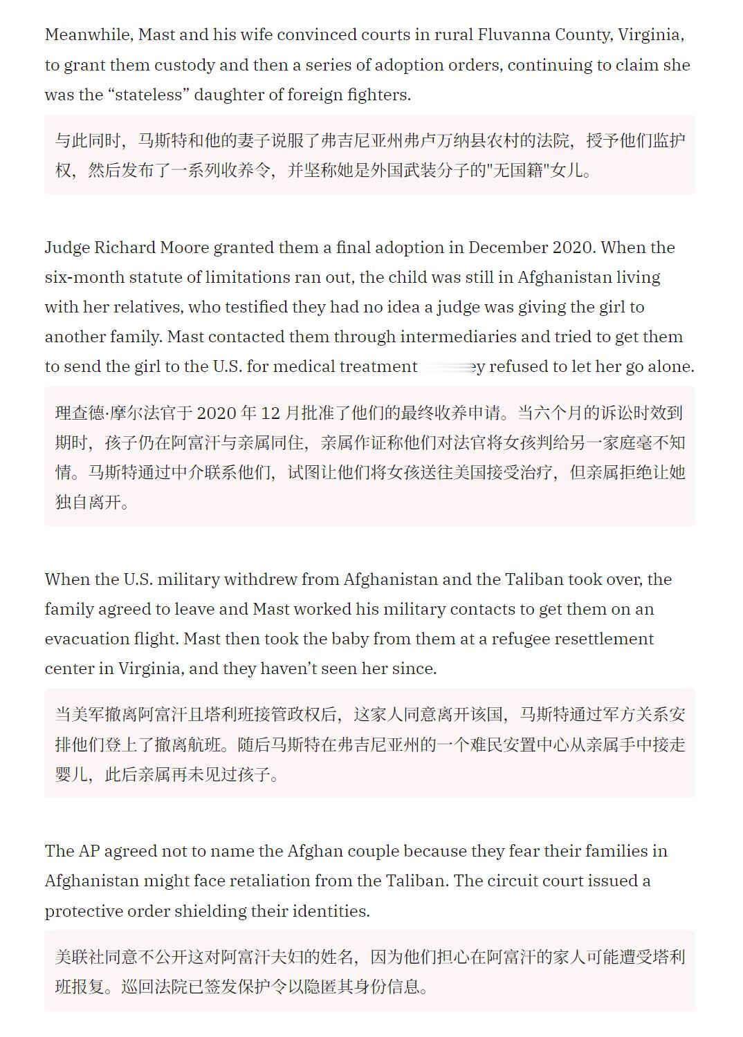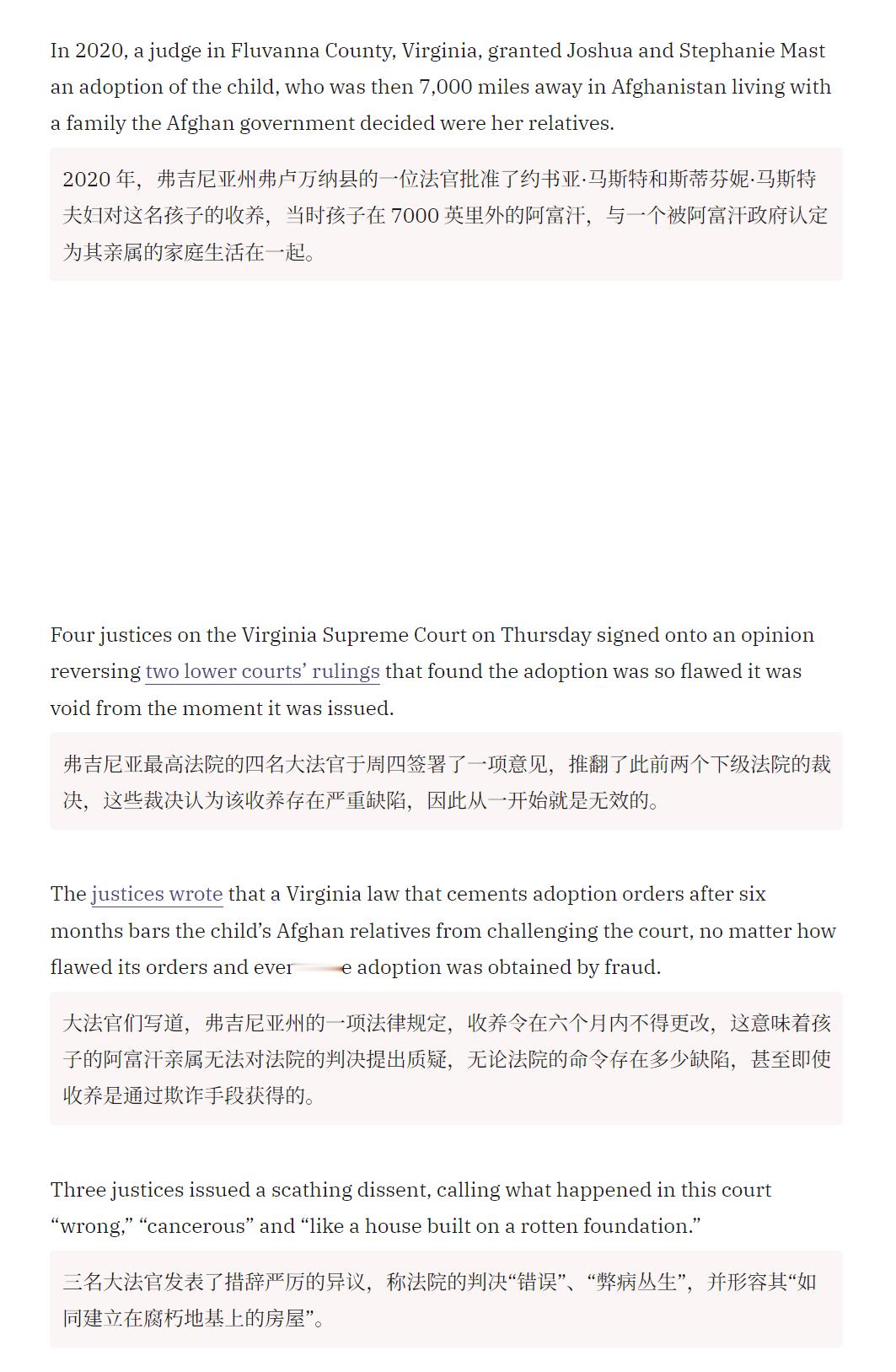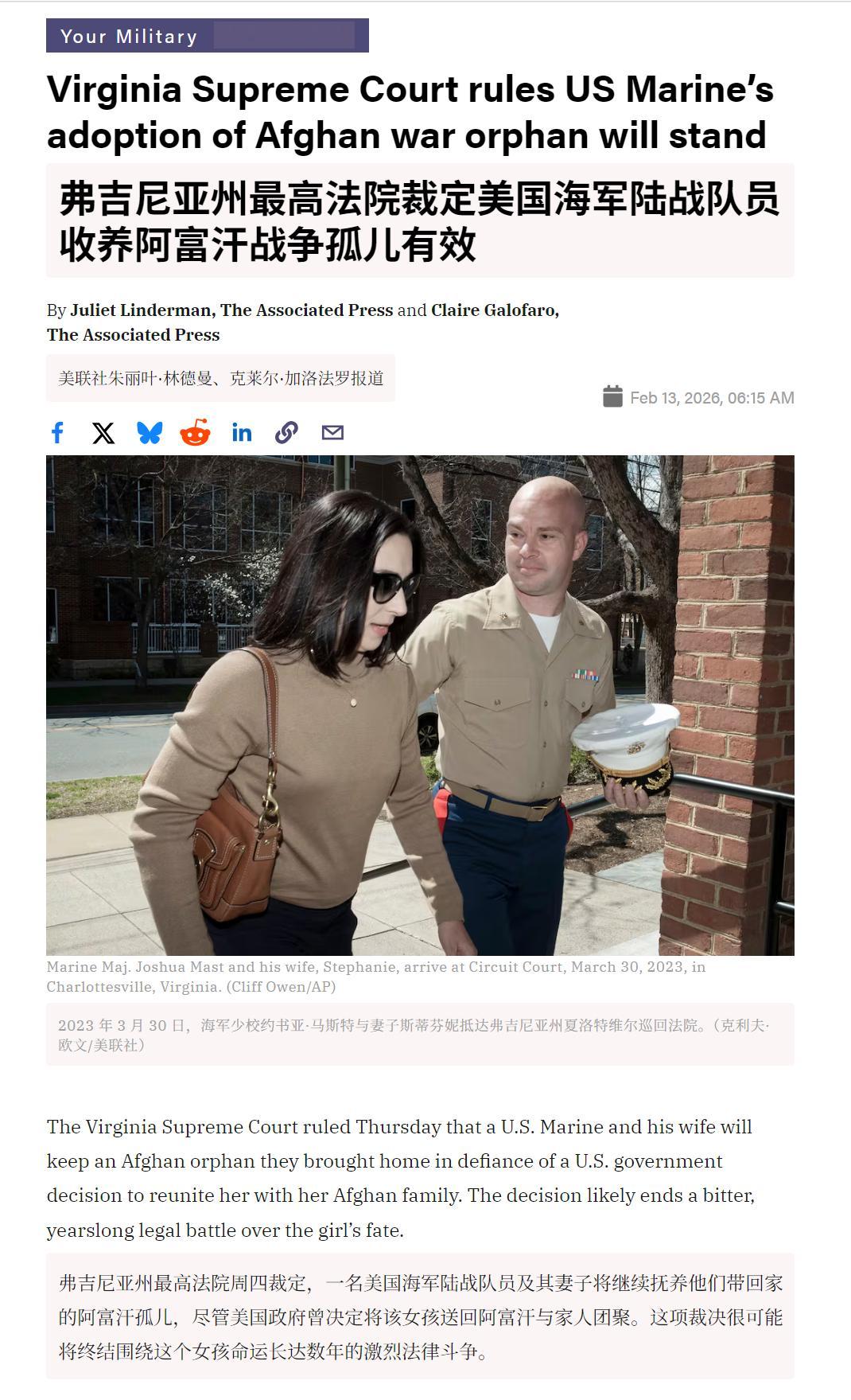 🔻抽象新闻一则:弗吉尼亚州最高法院裁定美国海军陆战队员“收养”阿富汗战争孤儿有效。🔻这个女孩的父母和兄弟姐妹死于美军突袭,然后,这名美国海军陆战队员从女孩的亲属手中以美国法院判决带走了孩子。🔻阿富汗亲属作证称:他们对美国法官将女孩判给另一美国家庭毫不知情。🔻另外,一个由三名成员组成的美军陆战队委员会认定,尽管乔舒亚·马斯特少校在试图将这名女婴带回家的过程中有失军官身份的行为,但这不足以让他离开军队,他将继续保持美军现役身份。🔻马斯特和他的妻子斯蒂芬妮当时住在弗吉尼亚州弗卢万纳县的农村地区。他们说服那里的一名美国法官批准他们收养这名孩子,即使她仍留在阿富汗,因为阿富汗政府正在寻找她的其他亲属并让她与他们团聚。🔻马斯特在塔利班于 2021 年接管阿富汗后,帮助这个家庭离开了阿富汗。一抵达美国,马斯特就利用美国法庭的收养文件让联邦政府将孩子从她的阿富汗亲属身边带走(这些亲属在阿富汗养育了她 18 个月),并交给了马斯特。🔻via 军事时报热点现场海外新鲜事